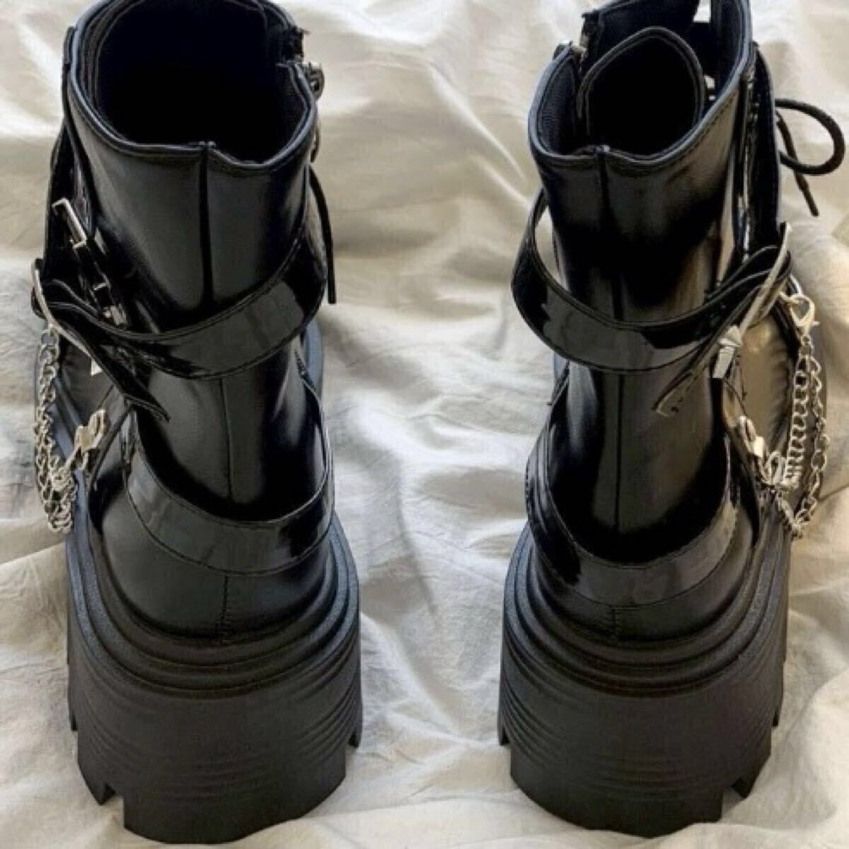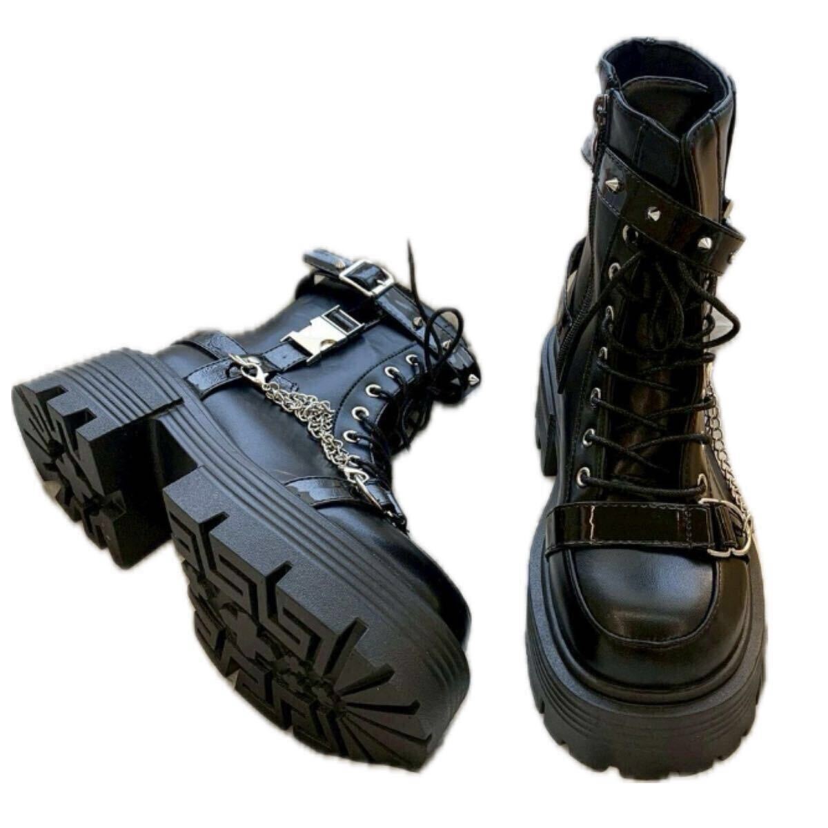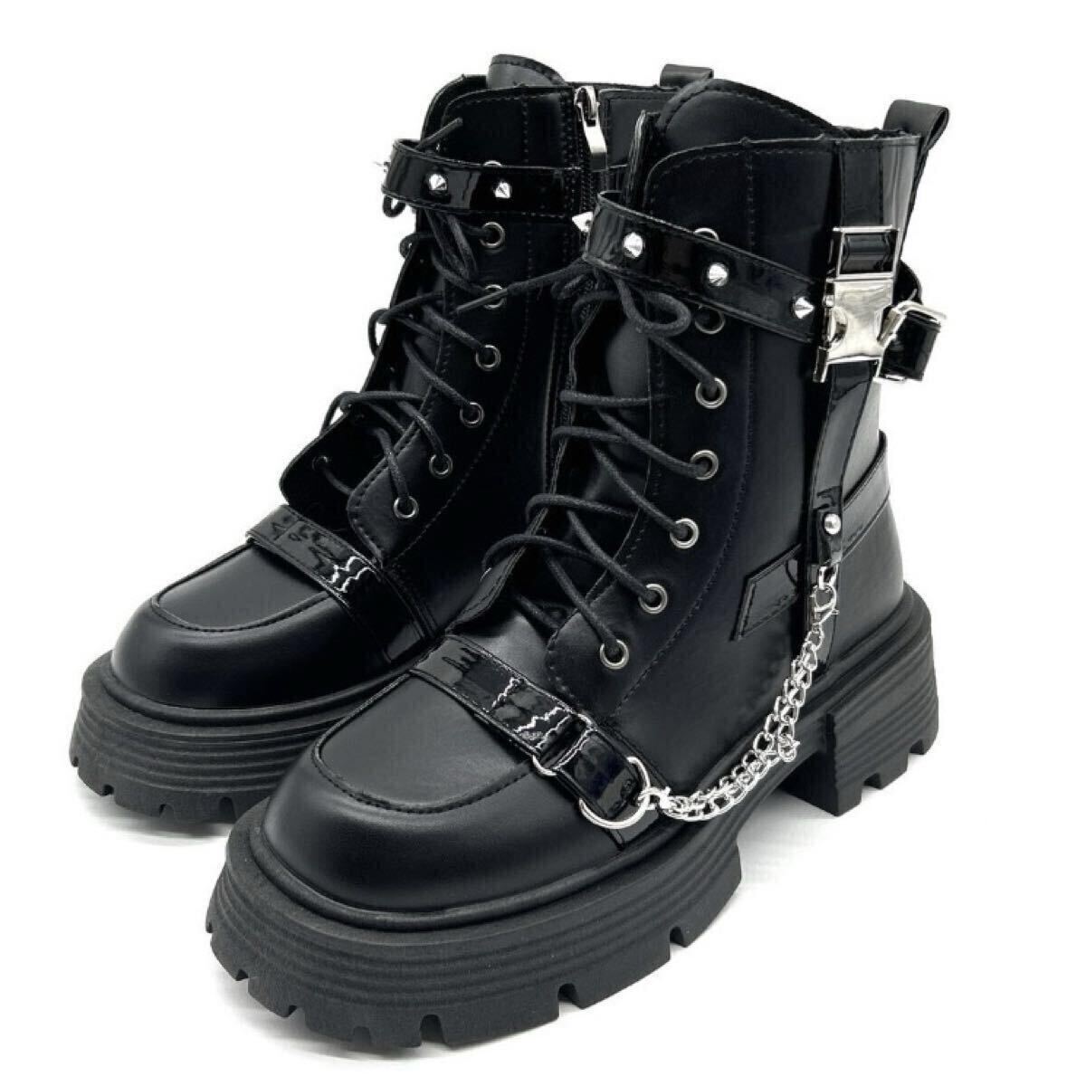 厚底デザインとチェーン装飾が特徴のブラックレースアップブーツ。