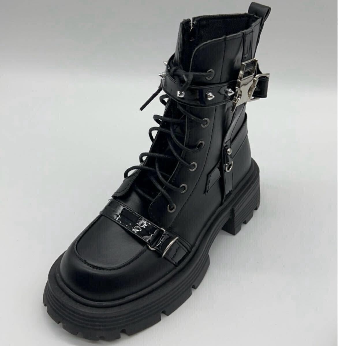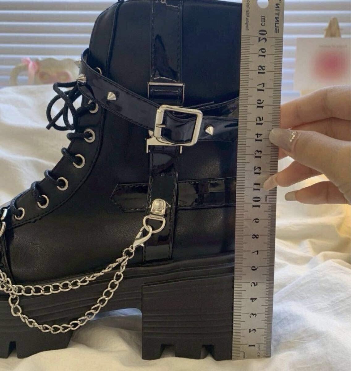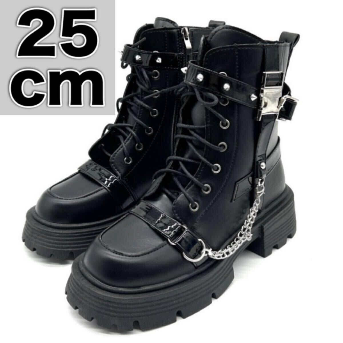 厚底デザインとチェーン装飾が特徴のブラックレースアップブーツ。