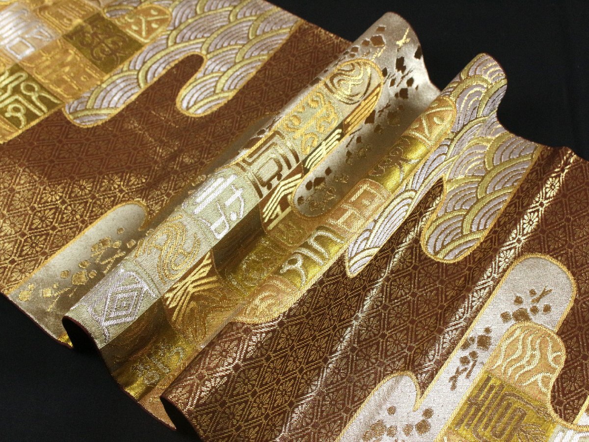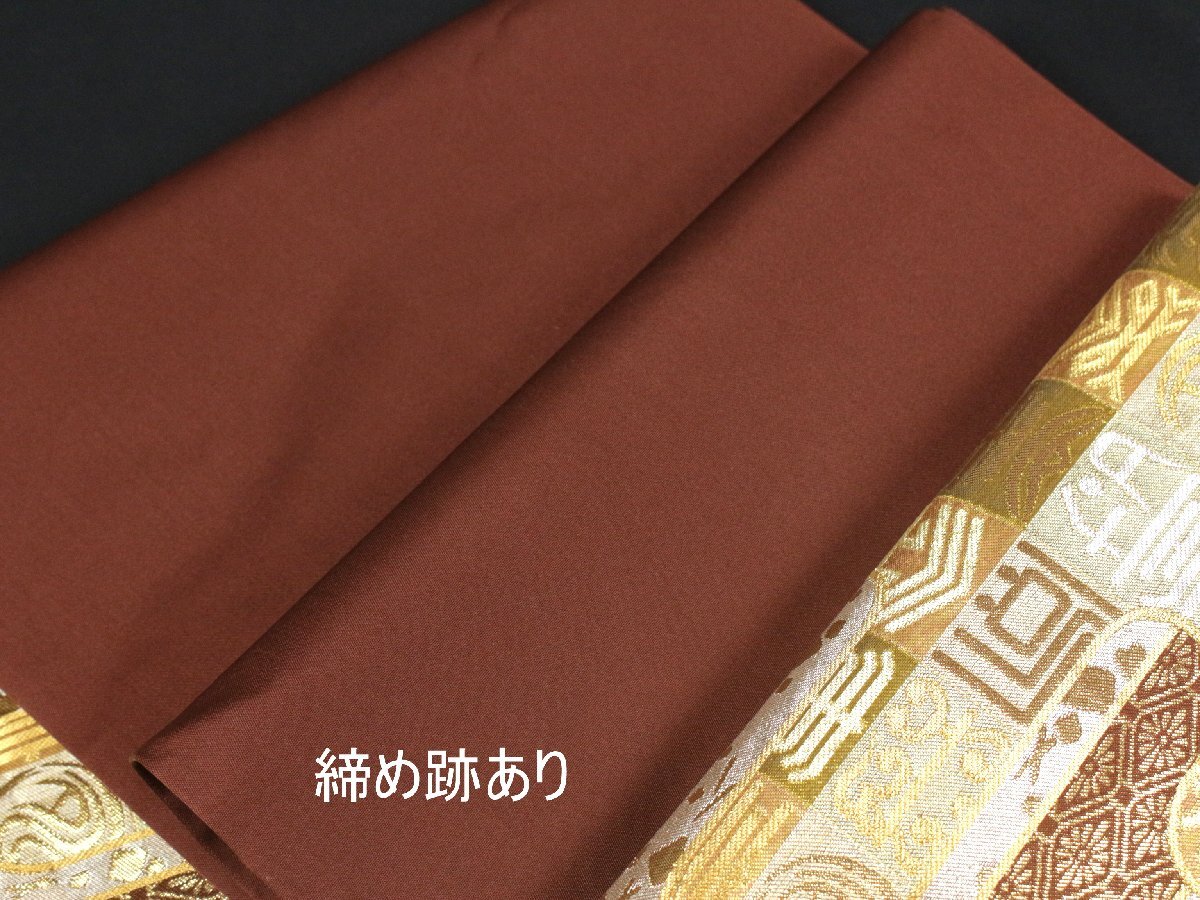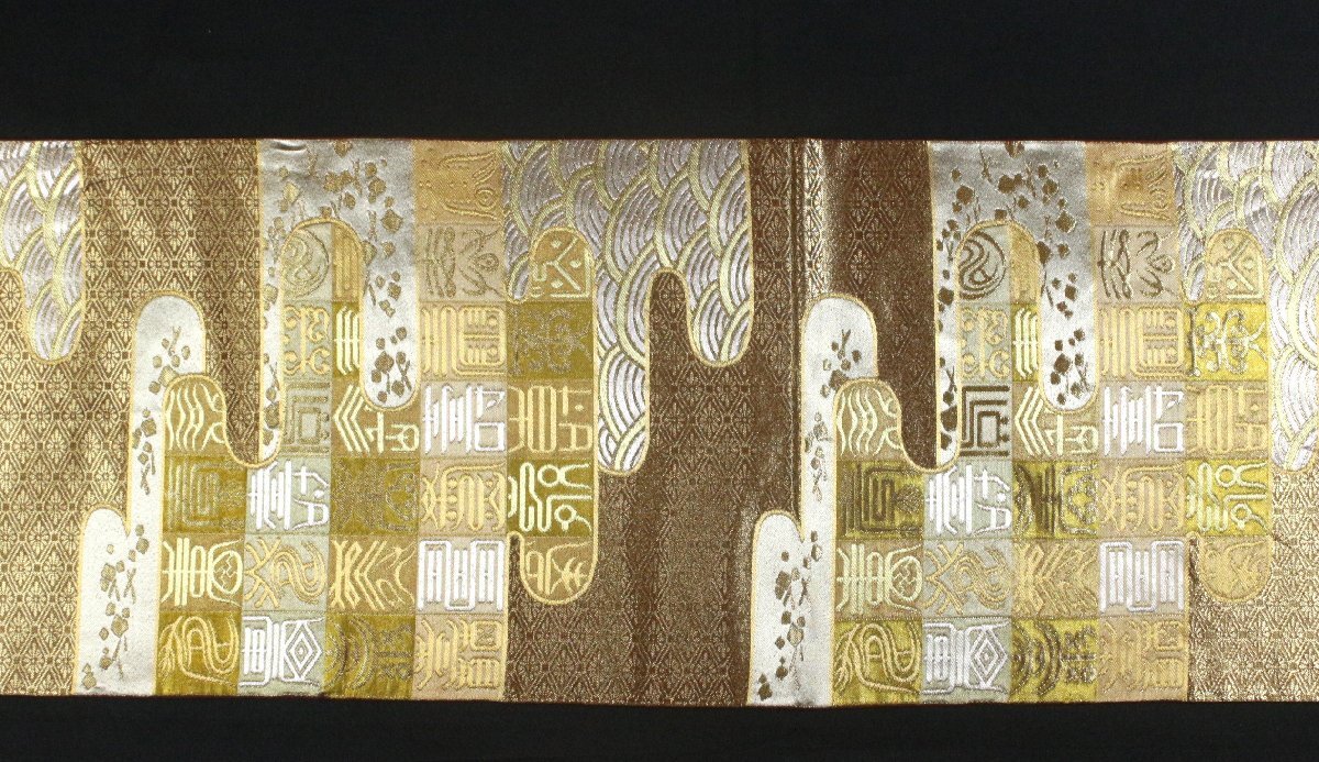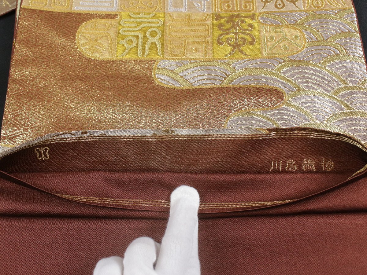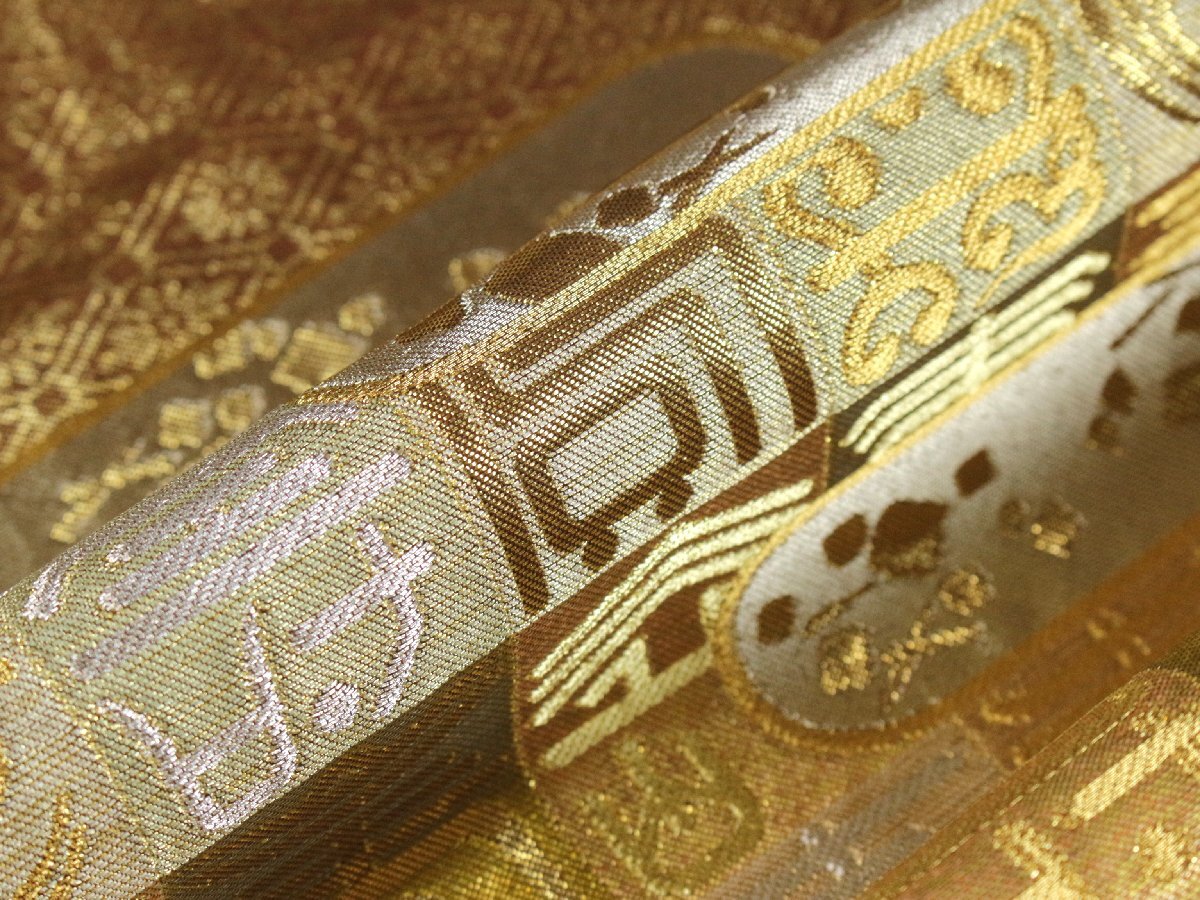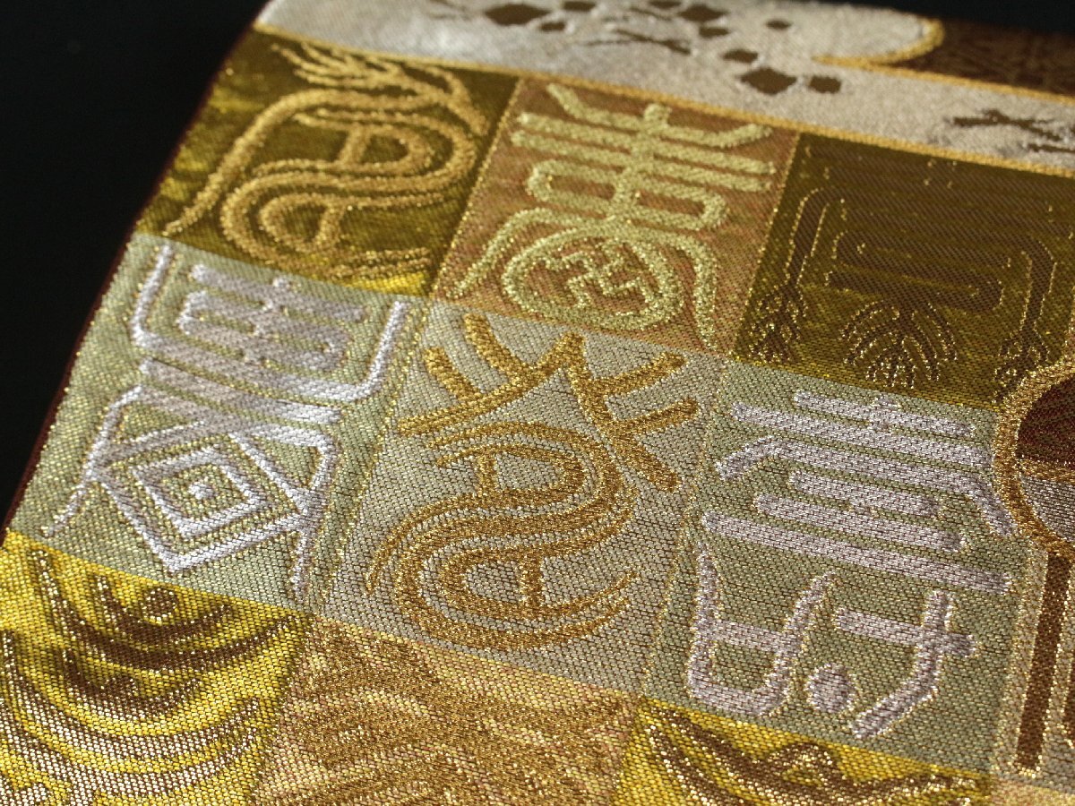 格式と美を誇る西陣の名門「川島織物」謹製、正絹袋帯のご紹介です。 格調高い金地に、吉祥文字文を配し、優雅にまとめ上げた気品あふれる意匠。 金銀糸を贅沢に織り込み、重厚感と華やかさを兼ね備えた、川島織物ならではの高度な織技が光る逸品です。 細部にまで繊細に表現された文様が、角度によって美しく輝きを変え、立体的な陰影と豊かな奥行きを生み出しています。 フォーマルな装いにふさわしく、式典・お祝いの席・お茶席など、あらゆる晴れやかな場面に映える帯。 西陣の名門が手掛けた、気品と格調を兼ね備えた逸品袋帯を是非末永くご愛用くださいませ。 ※撮影時の部屋の照明によって画像の色に若干の差がございます。色味に差がございますことをご了承のうえご検討下さいませ。 …状態… 締め跡あり。 ※全くの新品ではございませんので、記載のない変色やスレ、ヤケ、その他僅かな難がある場合がございます。そのような理由でのキャンセルはお受けできませんので、ご了承の上ご検討お願いいたします。 |