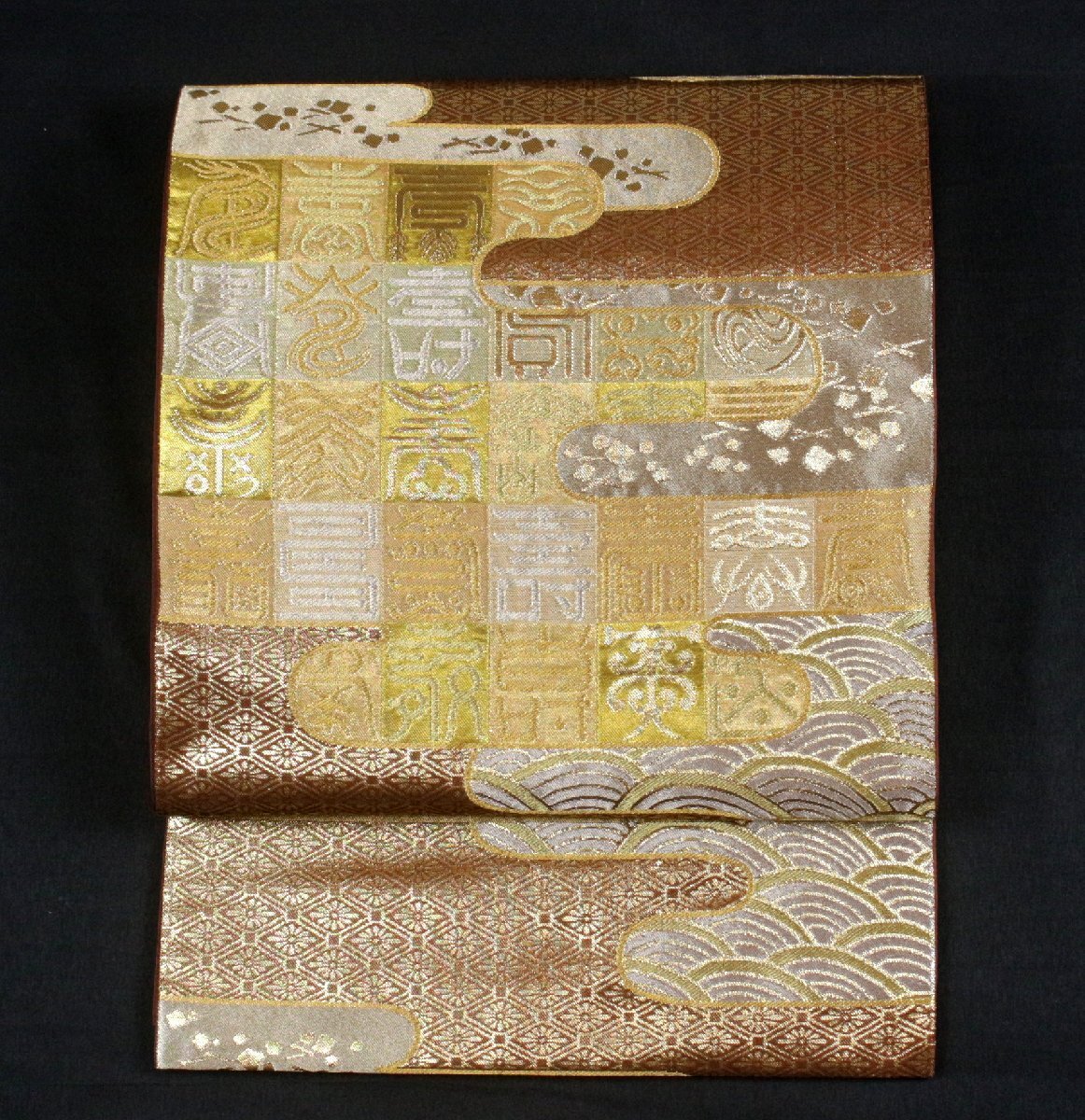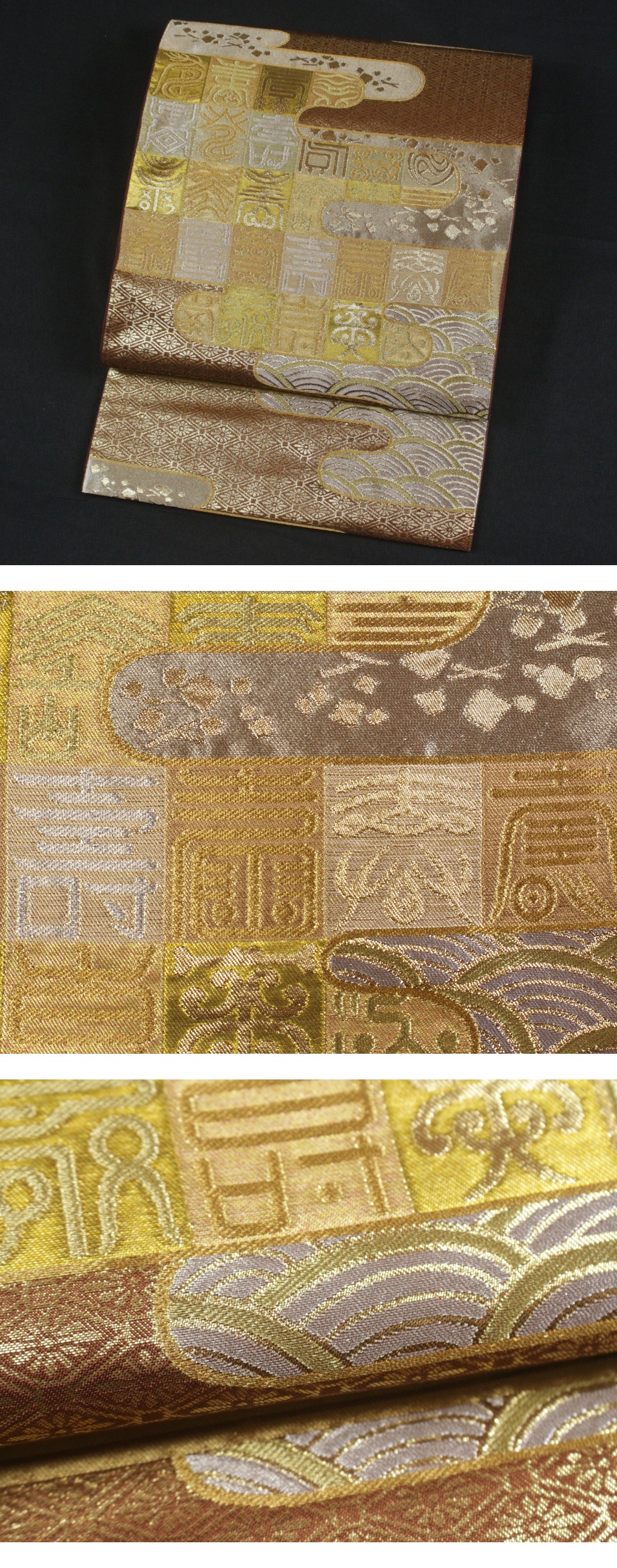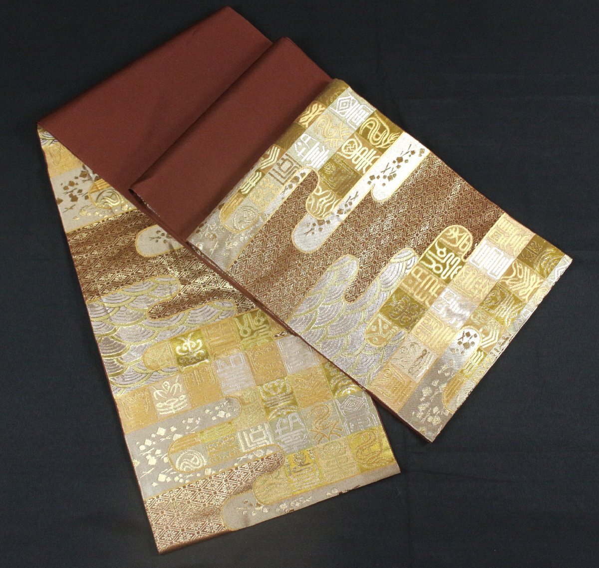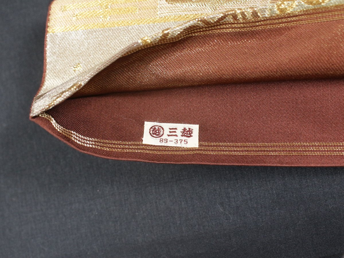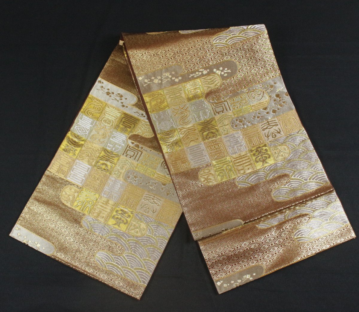 格式と美を誇る西陣の名門「川島織物」謹製、正絹袋帯のご紹介です。 格調高い金地に、吉祥文字文を配し、優雅にまとめ上げた気品あふれる意匠。 金銀糸を贅沢に織り込み、重厚感と華やかさを兼ね備えた、川島織物ならではの高度な織技が光る逸品です。 細部にまで繊細に表現された文様が、角度によって美しく輝きを変え、立体的な陰影と豊かな奥行きを生み出しています。 フォーマルな装いにふさわしく、式典・お祝いの席・お茶席など、あらゆる晴れやかな場面に映える帯。 西陣の名門が手掛けた、気品と格調を兼ね備えた逸品袋帯を是非末永くご愛用くださいませ。 ※撮影時の部屋の照明によって画像の色に若干の差がございます。色味に差がございますことをご了承のうえご検討下さいませ。 …状態… 締め跡あり。 ※全くの新品ではございませんので、記載のない変色やスレ、ヤケ、その他僅かな難がある場合がございます。そのような理由でのキャンセルはお受けできませんので、ご了承の上ご検討お願いいたします。 |