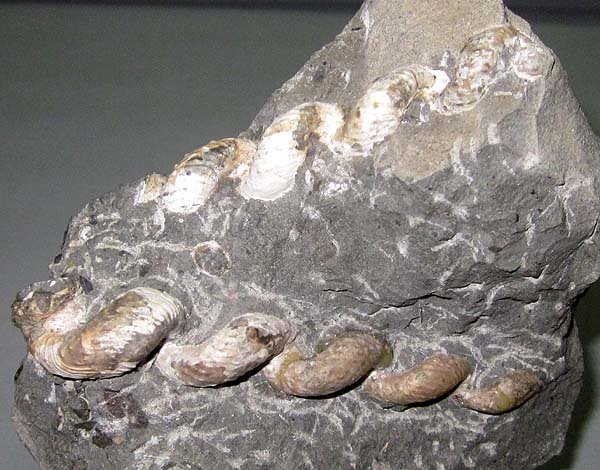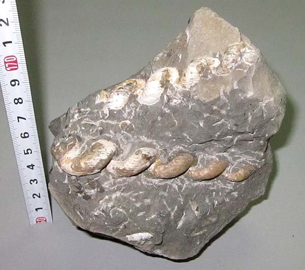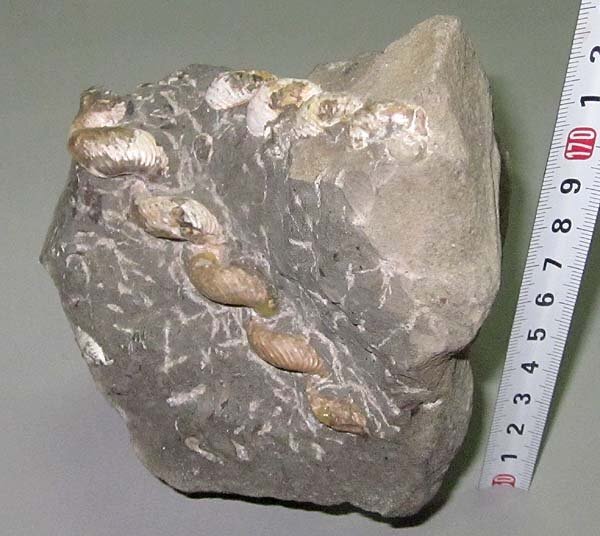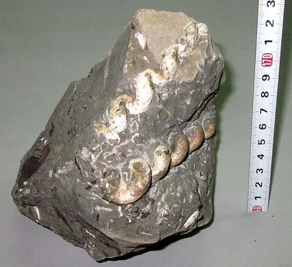 異常巻きアンモナイトのハイハントセラスが同一母岩に2個体(約4段巻と約5段巻)が見られる標本です。