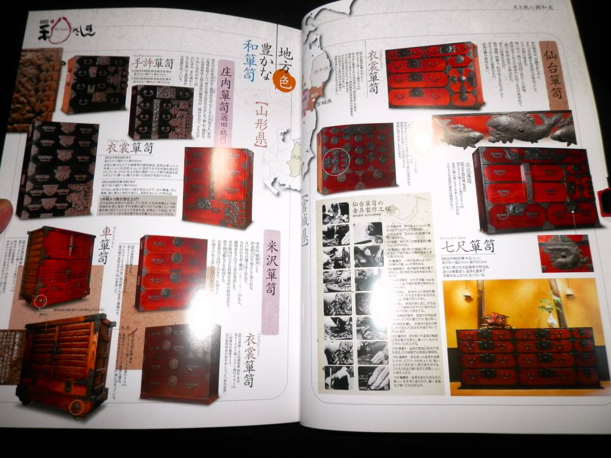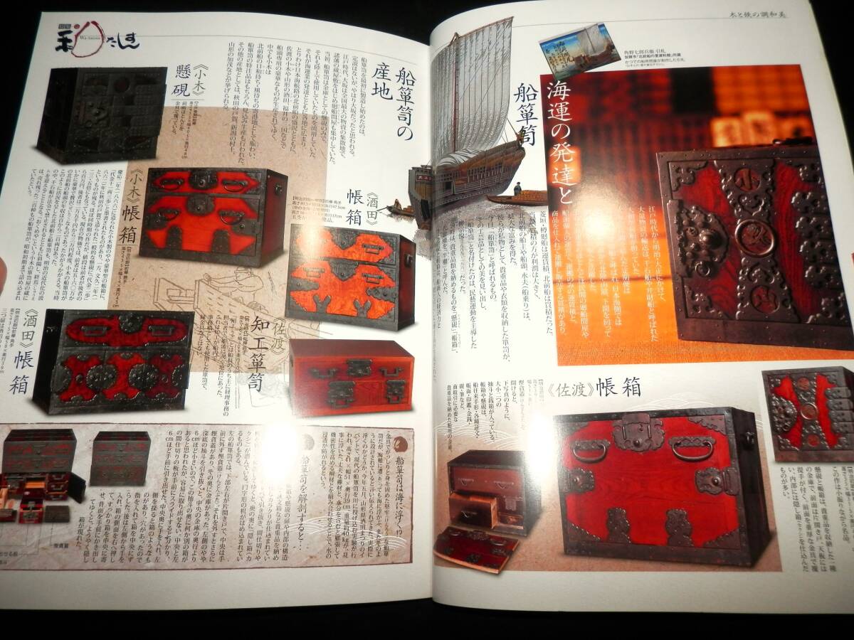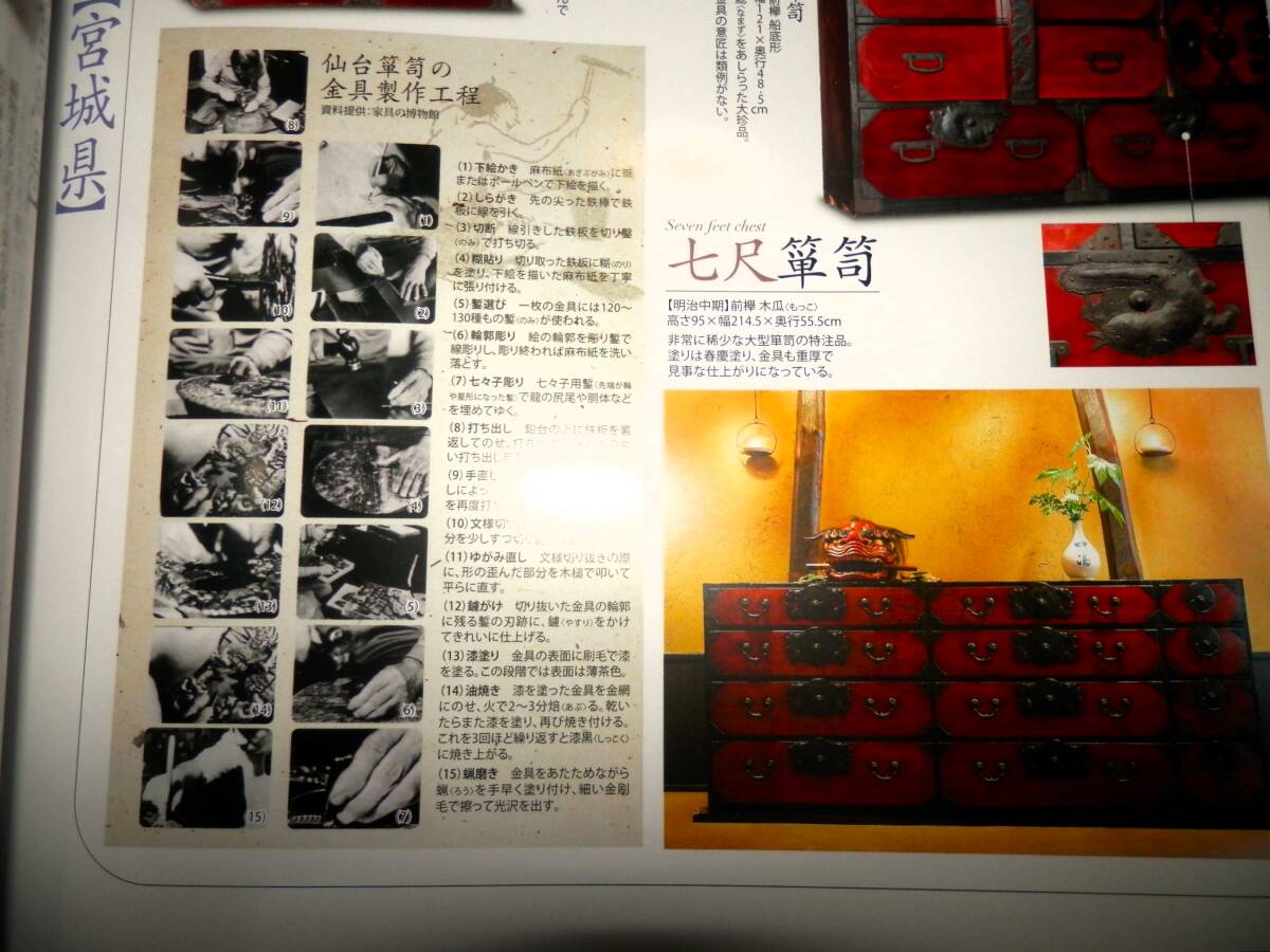 ■■『雑誌』・・・■■ ●●『集』・・・●● ―”第34号”― ◆集出版社。 ―”特集・壱”― ■■『木と鉄の調和美・和たんす』・・・■■ ●「表紙より」・・・● ―”特集・壱”― ◆木と鉄の調和美・『和たんす』。 ★杢目の波紋のような流麗さ、漆塗のつややかな 照りと重厚かつ繊細な鉄金具との調和美・「和 箪笥」・に融合された、木と鉄の匠の技を探訪 する。 ―”特集・弐”― ◆山岸コレクション・『鍵と錠』。 ―”特集・参”― ◆特別インタビュー・『草木と生きる』・草木染・ 山崎青樹。 ■発行日=2007年9月。 ■発行所=株式会社・集出版社。 ■サイズ=18×25.5×1.5cm。 ■状態=美品。 ●表紙に・キズ・ヤケが有ります。 ●本誌内に・わずかな・ヤケが見えますが ●大きなダメージは・無く ●年代的には・良い状態に思います。 ◆◆注意・・・◆◆ ★発行日より・経年を経て下ります。 コンディションに係らず・古書で有る事を 充分に御理解の上・御入札下さい。 ★神経質な方は入札をご辞退下さい・・!! ●全・196頁・・・!! ●特集①・「和箪笥―木と鉄の調和美」。 **”(11頁)”** ―”協力”― ◆かやぶきの郷・薬師温泉・旅籠/箪笥金具職人・ 野崎正明/財団法人・家具の博物館/加賀市・北 前船の里資料館/東京都立中央図書館/時代箪笥 ・「和合」・和合和彦/ギャラリー志摩・陶山治 /ほその書店・細野敏雄。 ―”参考文献”― ◆『箪笥』・小泉和子。 ・(法政大学出版局)。 ◆『和箪笥百選』。 ・(家具の博物館収蔵品図録)。 ◆緑青11・『和箪笥―木と鉄の感触』。 ・(マリア書房)。 ◆緑青21・『時代箪笥―地域別特色と分類』。 ・(マリア書房)。 ◆別冊太陽137・『和家具』。 ・(平凡社)。 ●特集②・「鍵と錠」。 **”(2頁)”** ―”協力”― ◆山岸賢司/群馬県立歴史博物館。 ―”参考文献”― ◆『和錠と宝尽し図鑑』・加藤早苗。 ●特集③・草木染作家・山崎青樹・Interview ・「草木と生きる」。 **”(2頁)”** ―”協力”― ◆草木屋/高崎市染料植物園。 ―”参考文献”― ◆『草木染―色を極めて五十年』。 ・山崎青樹。 ・(美術出版社)。 ◆『古代染色二千年の謎とその秘訣』。 ・山崎青樹。 ・(美術出版社)。 ◆『続・草木染―染料植物図鑑』。 ・山崎青樹。 ・(美術出版社)。 ◆『再刊・生活美学雑誌・月明』。 ・山崎青樹。 ●各項目と・各品に、解説が有ります・・・!! ●歴史のインテリア・骨董の値段がわかる・全国有名骨 董店の・最新・価格情報掲載! ◆専門誌では有りません・骨董誌の巻頭特集です。 ◆掲載の骨董店では・「和箪笥」・も多数掲載され て下ります。 ●蒐集・資料などの参考に・・・!! ●探されていた方は・この機会に・・・!! ●以下・詳細をご覧ください・・・!! ◆掲載案内は・抜粋して下ります。 ◆掲載内容は・Q&Aより・問い合わせ下さい。 ◆数字記載は目視です・間違いは御容赦下さい。 ●掲載を抜粋紹介し・「タイトル」・と致します。 ■■■■■■■■■■■■■■■■■■■■■■■■■■■ ★★★★★★★★★★★★★★★★★★★★★★★★★★★ ―”特集・壱”― ■■『木と鉄の調和美・和たんす』・・・■■ ★木と鉄、そして漆。 それらは古代より、日本の文化を根底から支えた三大 物質だといえる。 豊かな植生と天然漆に恵まれた日本では、太古より樹 木と漆の活用技術を連綿と育み続け。 世界太古の木造建築・「法隆寺」・をはじめ、精緻な 蒔絵工芸品など、幾多の文化遺産を残してきた。 そして鉄。 鉄鉱石の産出が少ない我が国は、砂鉄と木炭を利用し た独創的な製鉄法・「たたら製鉄」・を編み出し・「 ケラ」・と呼ばれる比類ない高純度の鉄塊とそれを鍛 造する技術から、世界に誇る日本刀の輝きを生み出し た。 もともと鉄の製造そのもので、緊密に関係し合った木 と鉄。 それらが、江戸時代半ばから、明治・大正にかけて庶 民の求めから発展した・「和箪笥」・の中で独特のハ ーモニーを奏でてゆく。 杢目の波紋のような流麗さ、漆塗のつややかな照りと 、重厚かつ繊細な鉄金具との調和美。 「和箪笥」・に融合された、木と鉄の匠の技を探訪す る。 ●●『和箪笥の誕生』・・・●● ―”箱から抽斗へ”― ◆車長持。 ・総欅。 ・車は栗材。 ・米沢産。 ・江戸中期~後期。 ◆武家長持。 ・総桐。 ・産地不明。 ・江戸時代。 ◆車箪笥。 ・総欅。 ・産地不明。 ・江戸後期~明治。 ●●『和箪笥・鑑賞の予備知識』・・・●● ●「箪笥各部の名称」・・・● **”22箇所”** ★1・天井板。 ★2・引き戸。 ★3・小抽斗。 ★4・盆。 ★5・棚板。 ★6・両開き・(観音開き)。 ★7・端喰。 ★8・抽斗。 ★9・裏板。 ★10・地板。 ★11・片開き戸。 ★12・仕切板。 ★13・定規縁。 ★14・側板・(帆立)。 ★15・閂。 ★16・台輪。 ★17・横脚。 ★18・前脚。 ★19・先側・(先板)。 ★20・底板。 ★21・奥行・(入側)。 ★22・前板。 ●「金具各部の名称」・・・● **”22箇所”** ★1・帯金具。 ★2・差込錠。 ★3・座金。 ★4・引手。 ★5・隅金