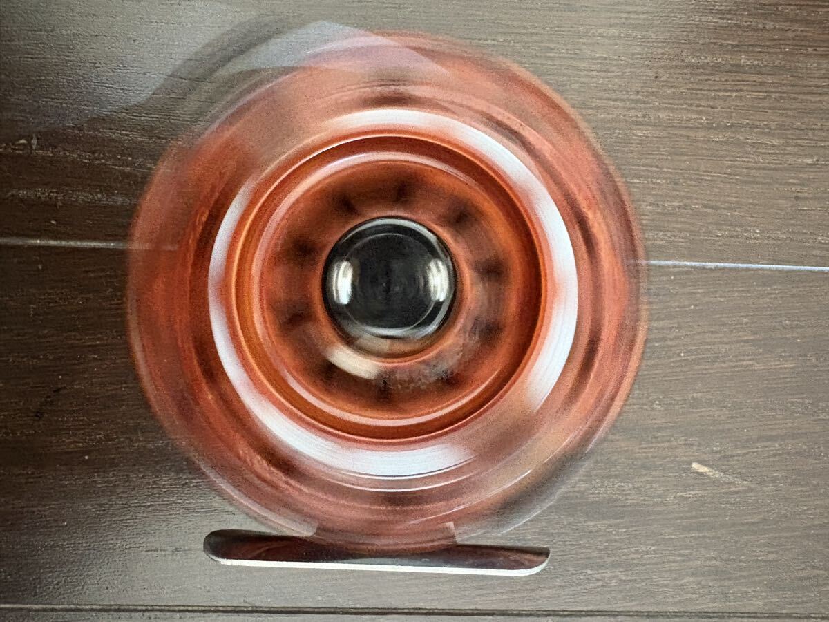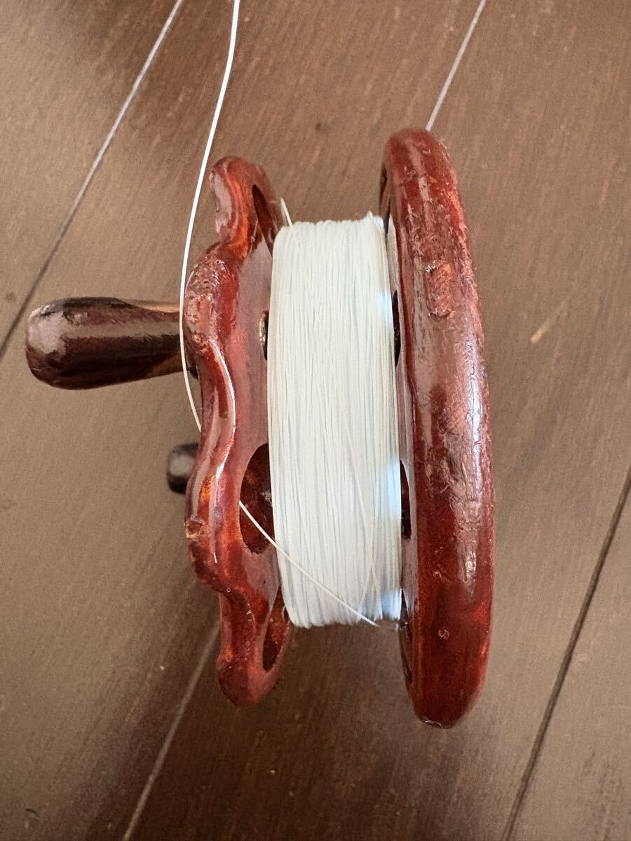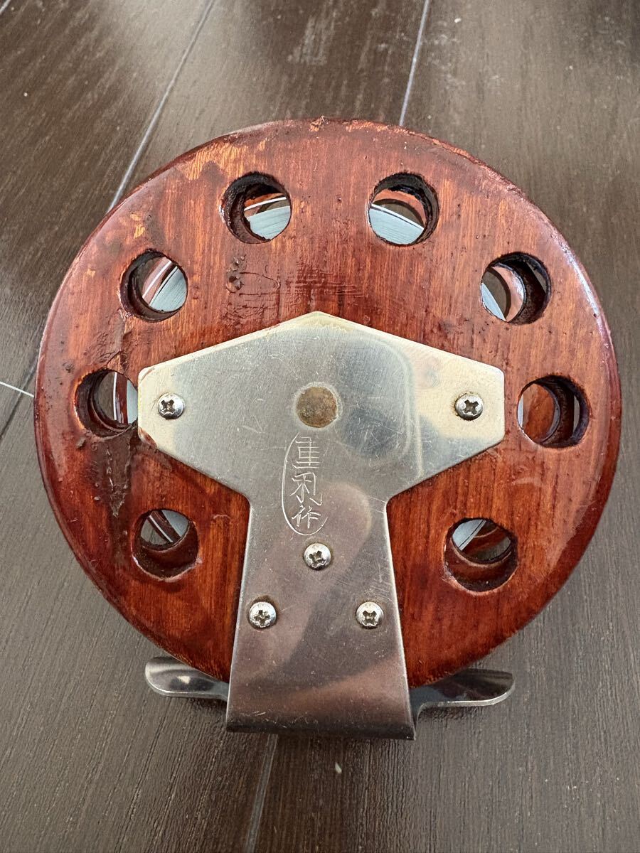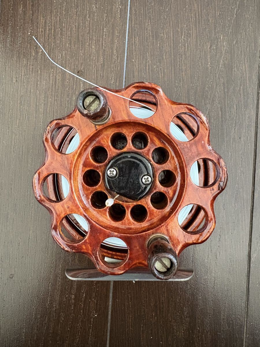 重利作ベアリング入り木製リールです、ヘチリール、回転は十分です、ラインはレグロンサイバー磯、超摩擦耐久ライン2号、同時に黒鯛工房ヘチリミテッド小継220も出品中しています。