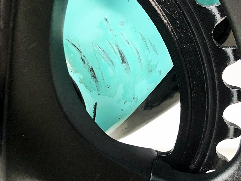 フレーム、その他外観:BBドライブサイド周りにチェーン落ちキズ、右シートステー、右フロントフォークエンド裏側、リアディレイラー、STIレバー、シートポスト、サドルにキズ、クランク、ホイールに小キズがあります。