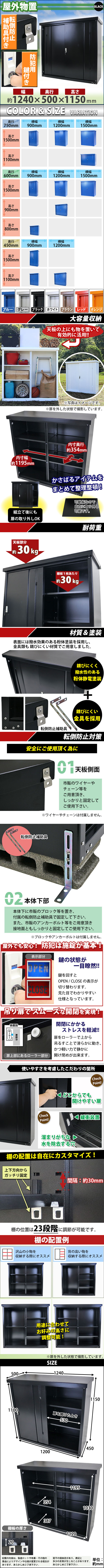 | 商品名 | 送料無料 屋外物置 スチール製 家庭用収納庫 鍵付き 黒 幅約1240mm×奥行約500mm×高さ約1150mm 倉庫 納屋 物置き スチール物置 スチール収納庫 ガレージ 収納 可動棚 吊り戸 吊戸 吊り扉 上吊り 吊引き戸 庭 ガーデン ブラック monookishw12d45h11bk |