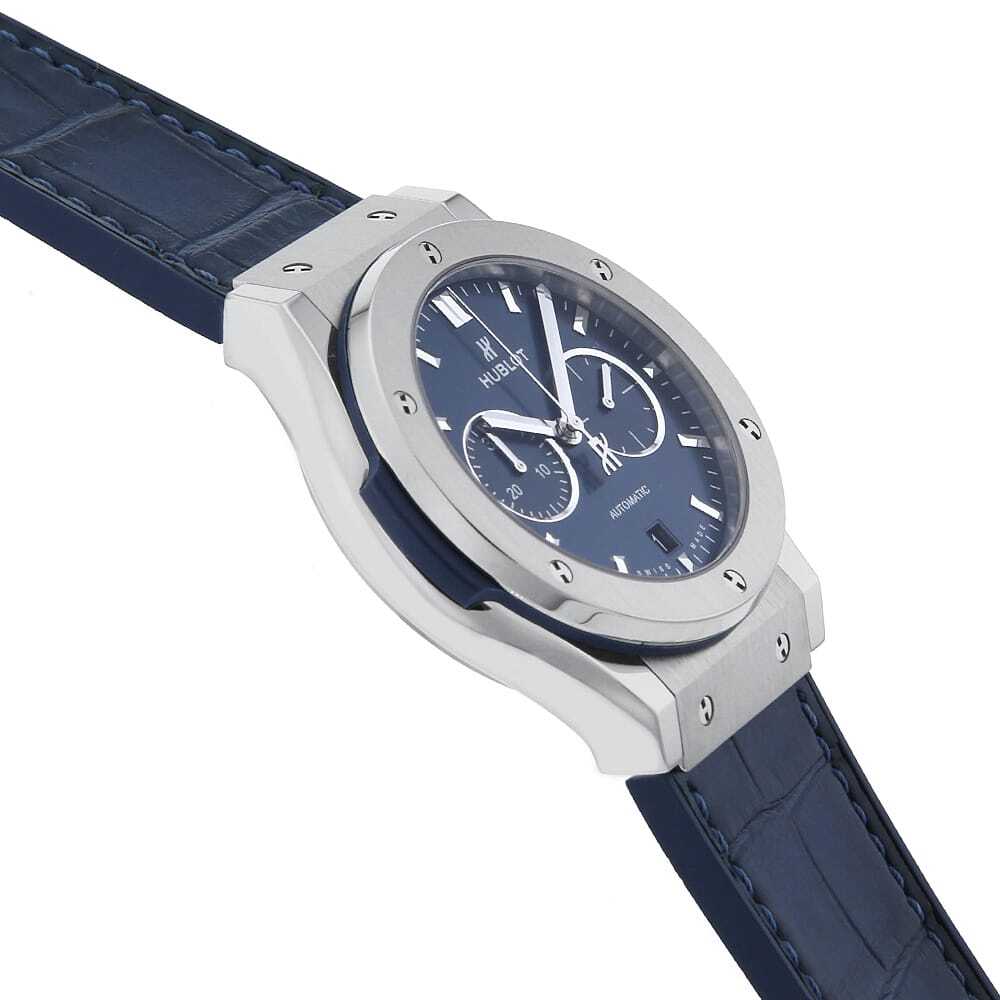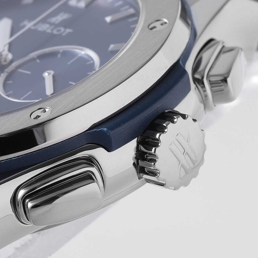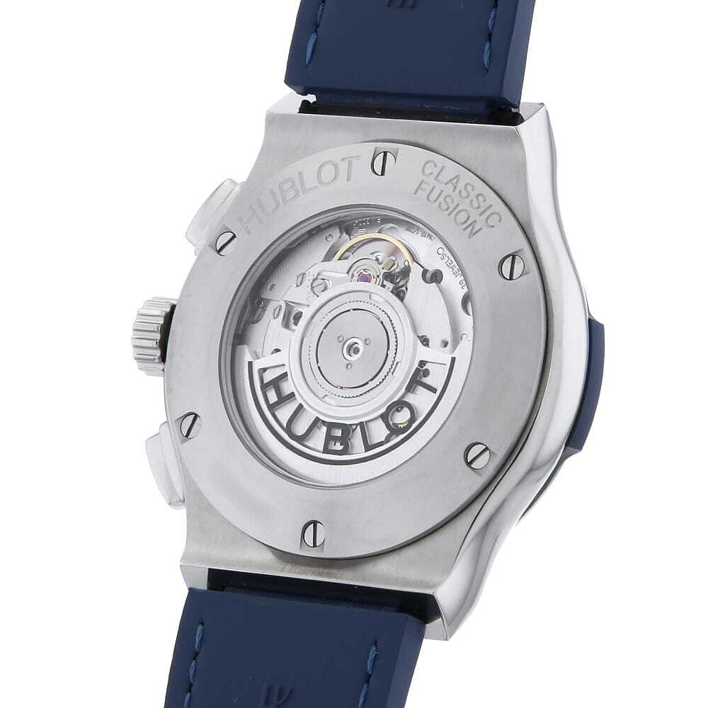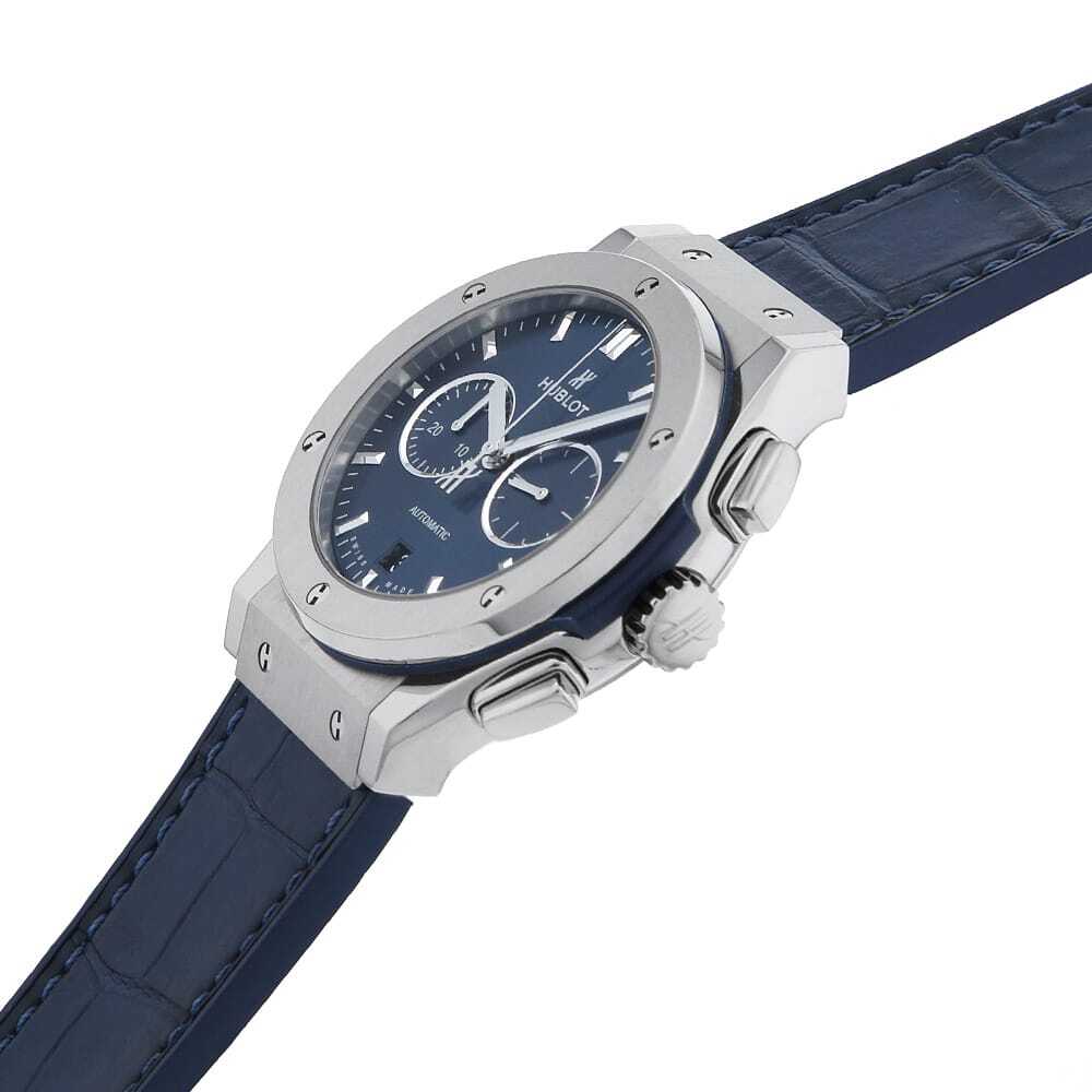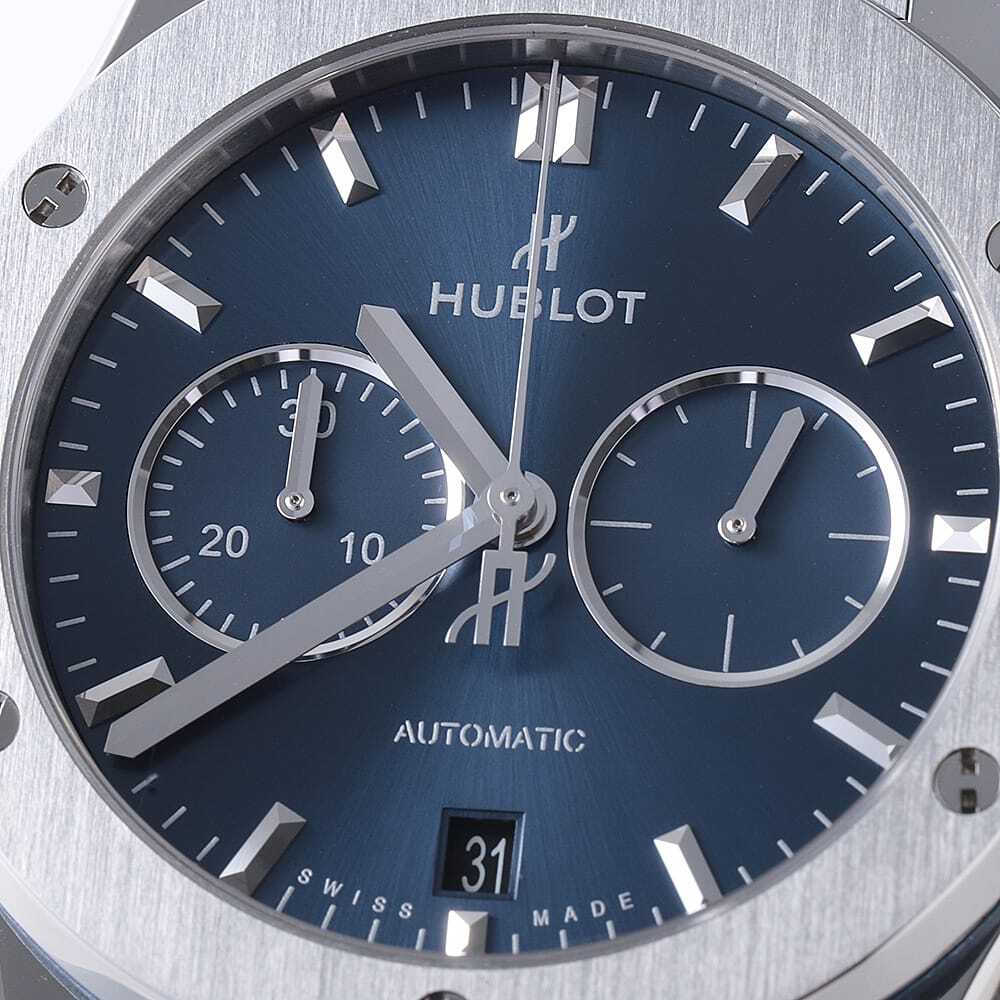 | モデル情報 | ウブロが掲げるフュージョン・コンセプトとクラシックシリーズが融合して生まれたクラシックフュージョンのクロノグラフモデルです。視認性の良いスモールセコンドや傷に強いチタンケースは実用性に優れています。ブルーの文字盤に同じくブルーのグミアリゲーターストラップを用いたこちらのモデルは、クールで落ち着いた雰囲気を演出してくれます。 |