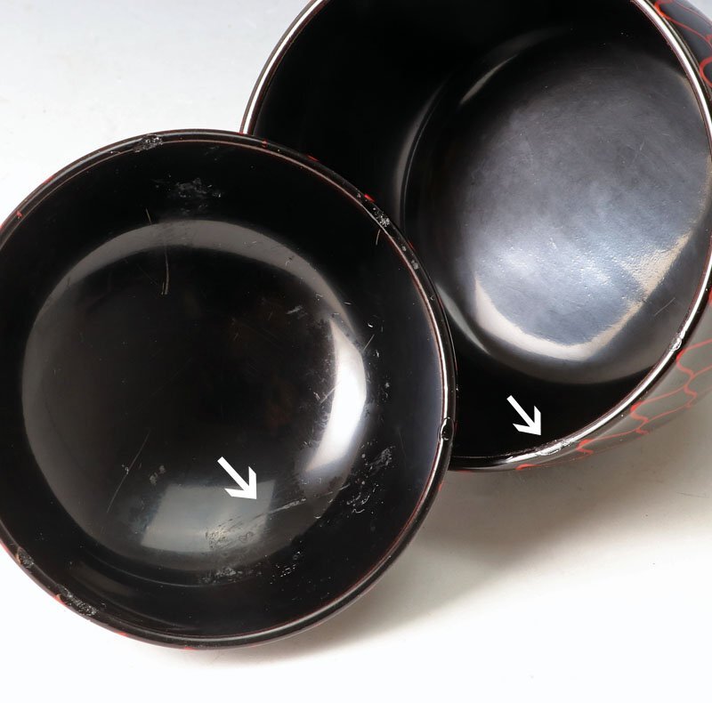 蓋にシミあり、一客の蓋と椀に塗直しあり(写真矢印部分参照) |