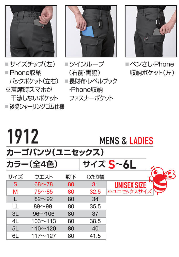 BURTLE バートル エコ制電カーゴパンツ 1912 秋冬 サイズS~3L 3L 35ブラック