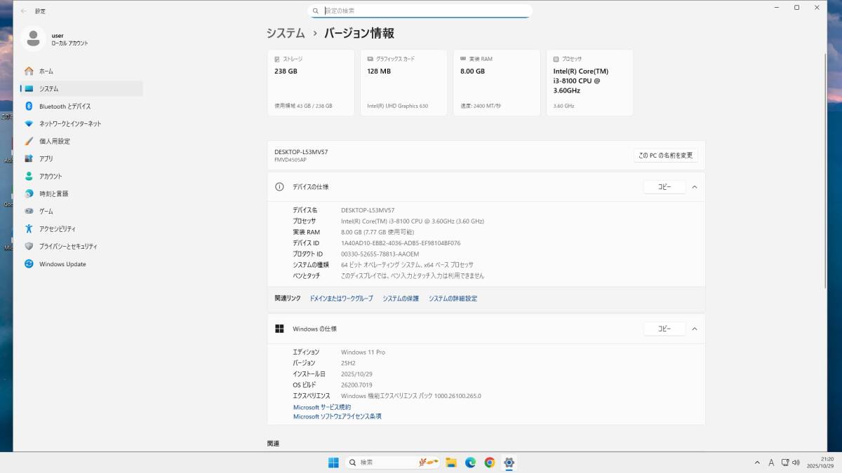 ・新品の256GBSSDを使用して、最新Windows11Pro(25H2)新規インストールしています。