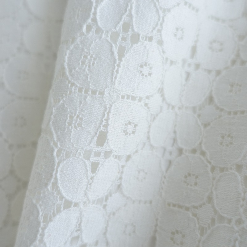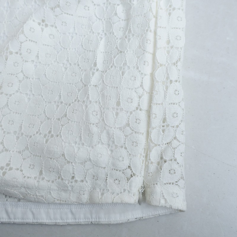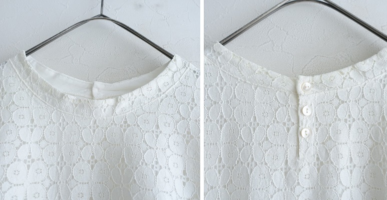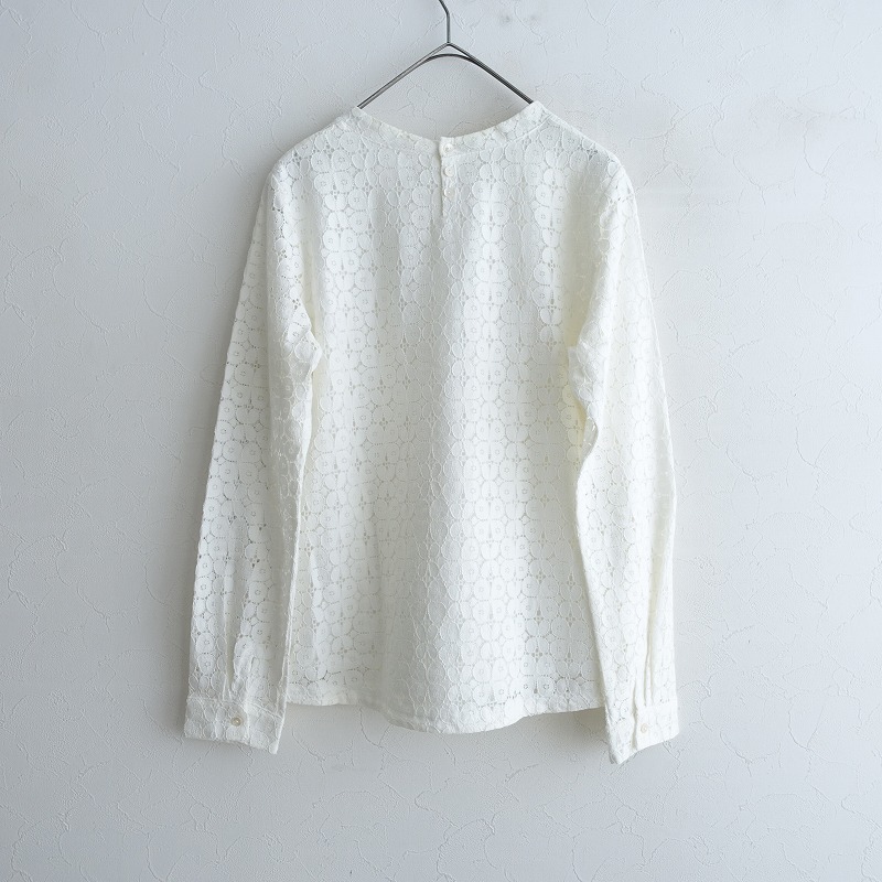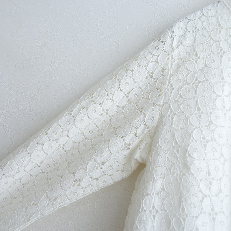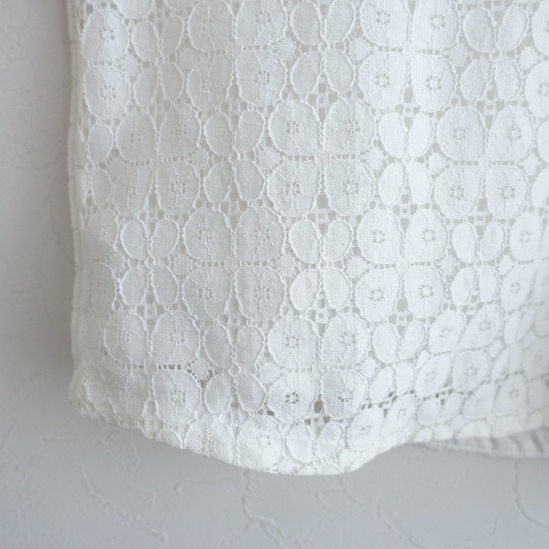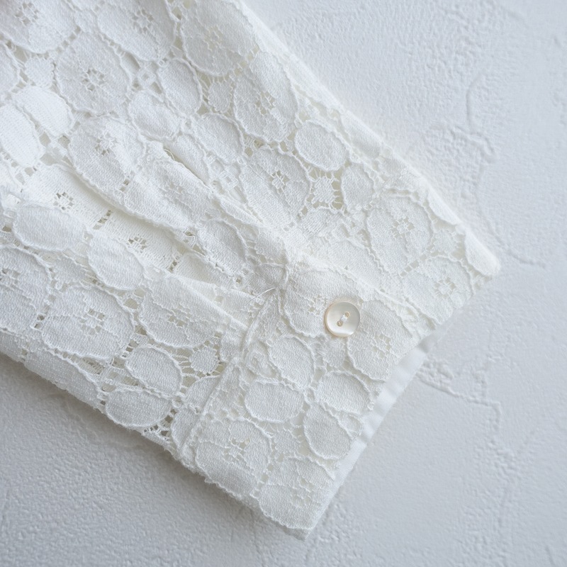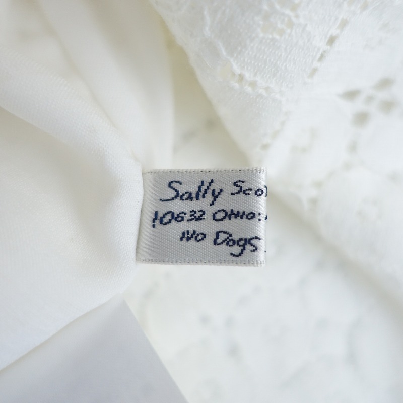 | Sally Scottのレースブラウスです。カラーはホワイトで、レース素材で仕立てられています。背上部にボタンと身頃左サイドにファスナー付きのプルオーバータイプの着脱で、身頃部分に裏地付きです。 |
