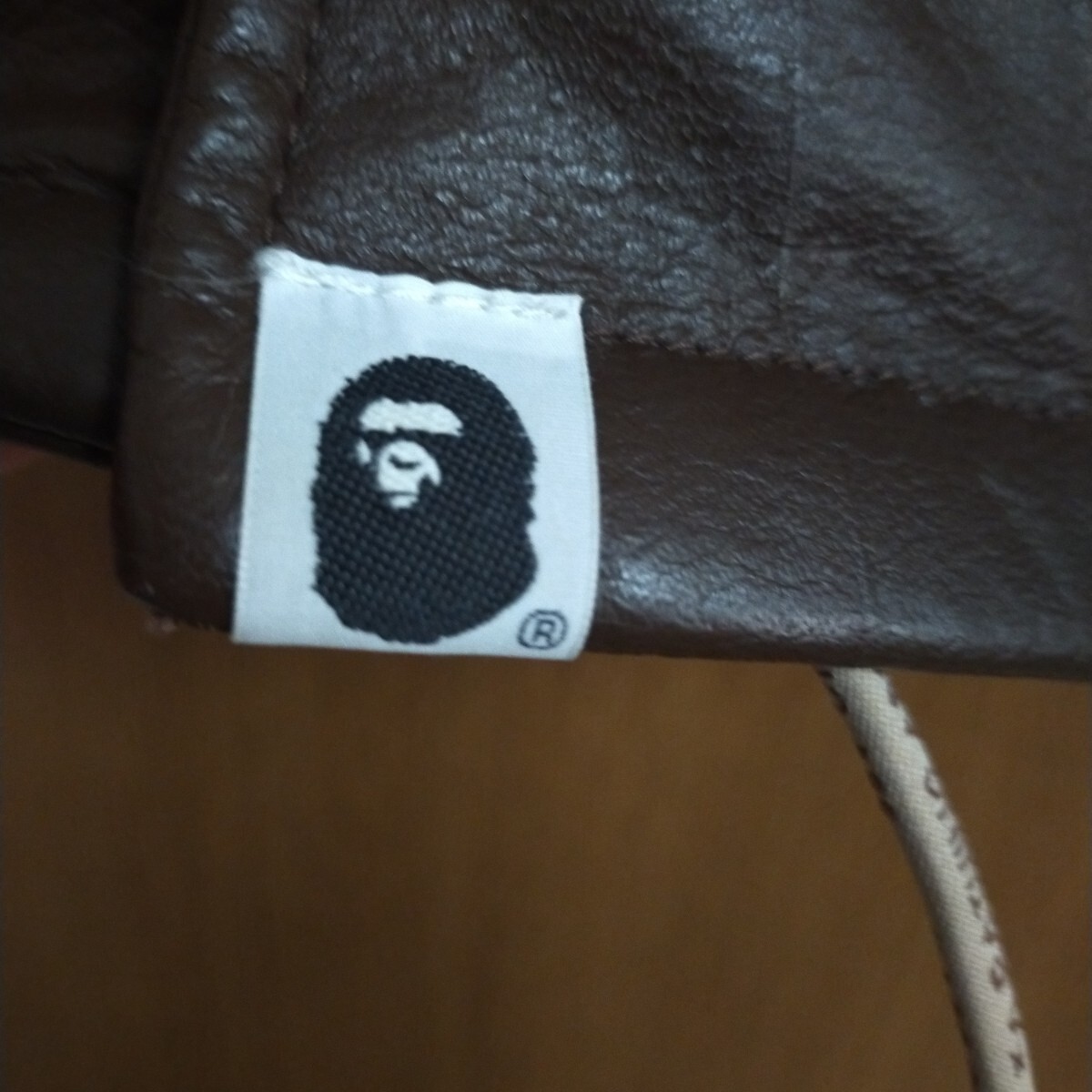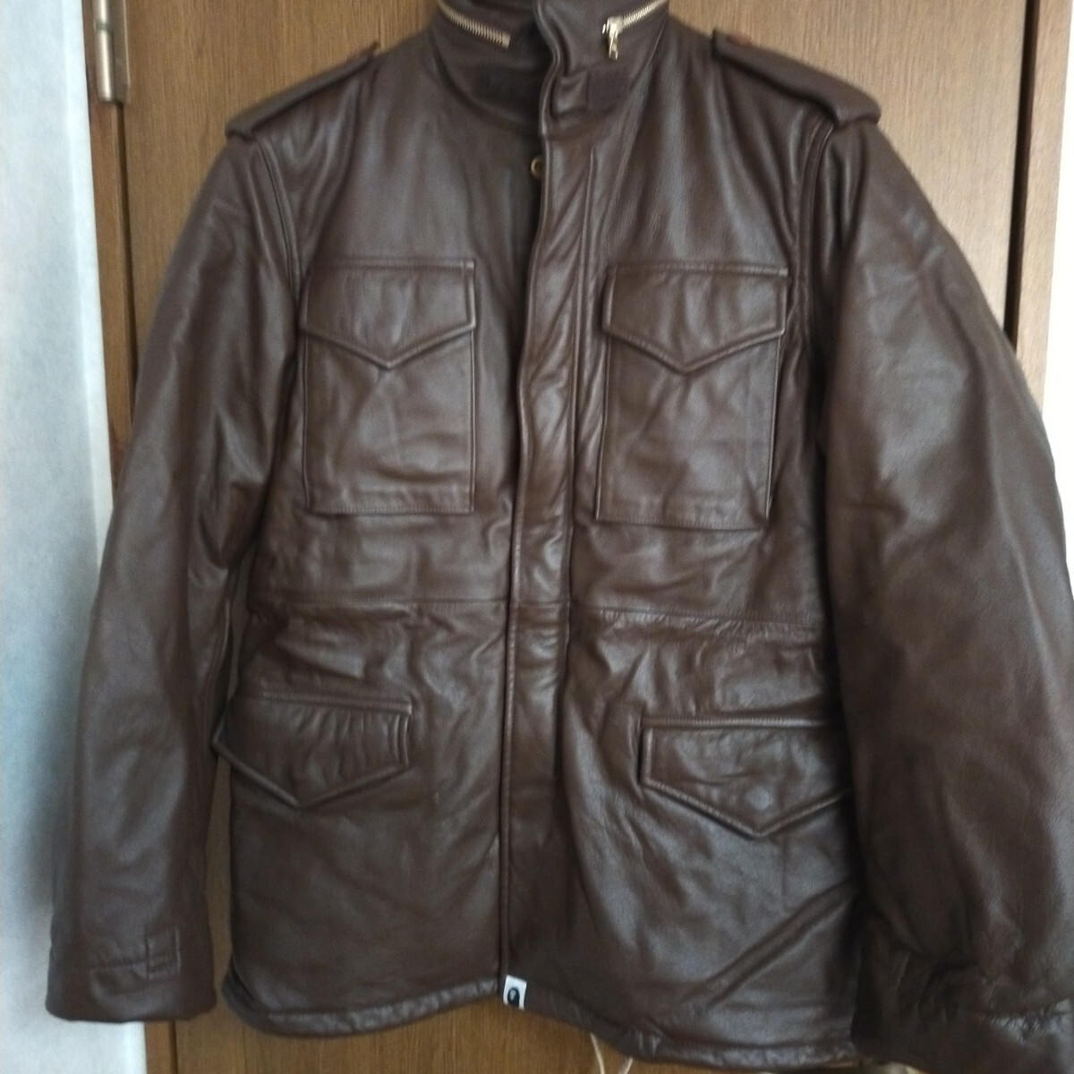 ブラウンレザーのミリタリースタイルジャケット、A BATHING APEのデザイン。