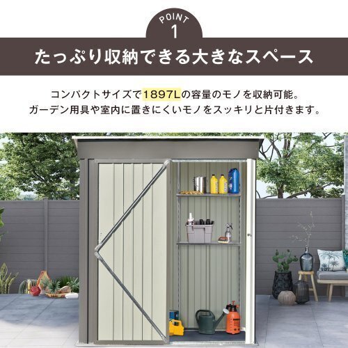 ・素材 スチール・カラー ブラウン、グレー・商品サイズ 幅162*奥行き92*高181・梱包数 1・梱包サイズ 171*50*12cm・重量(N.W.) 40kg商品の説明:◆01たっぷり収納できる大きなスペースコンパクトサイズで1897Lの容量のモノを収納可能。ガーデン用具や室内に置きにくいモノ
