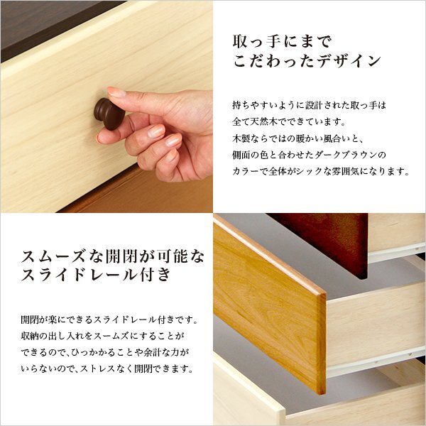 | 【ポイント】 ①美しい天然木を使用したチェストです。 ②スライドレールで楽々取り出し♪ ③届いてすぐ使える完成品です。 ④生産国は安心の日本製です。 ⑤シリーズで揃えればお部屋を明るくしてくれます。 |