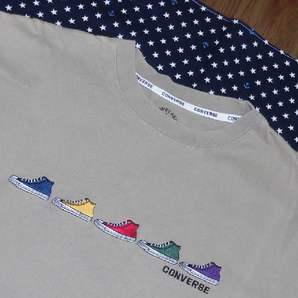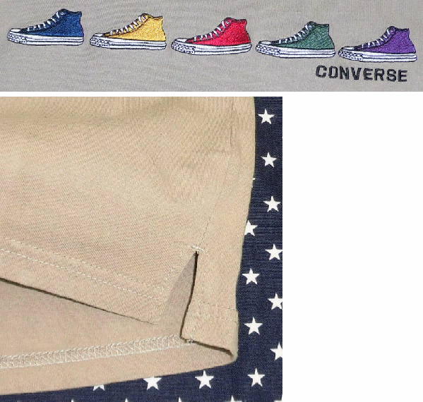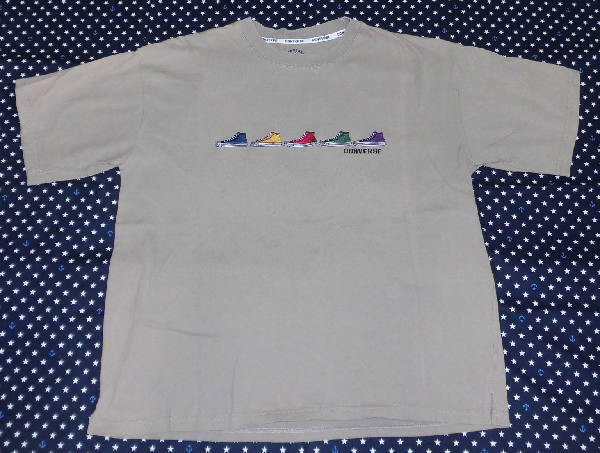 | よく着用しましたので、両肩と前身頃左に日焼けによる色ハゲが縦ラインに入っています。 また、少し使用感があります。 お安くどうぞ! ☆ サイズはL ☆ 色はベージュ ☆ 実寸は、身丈65センチ、肩幅54センチ、袖丈21センチ、 脇下の幅56センチ、裾幅55センチ ☆ 綿100% ☆ 丸首 ☆ 前身頃にアップリケと刺しゅう入り ☆ 両スソにスリット入り コンバース | ||