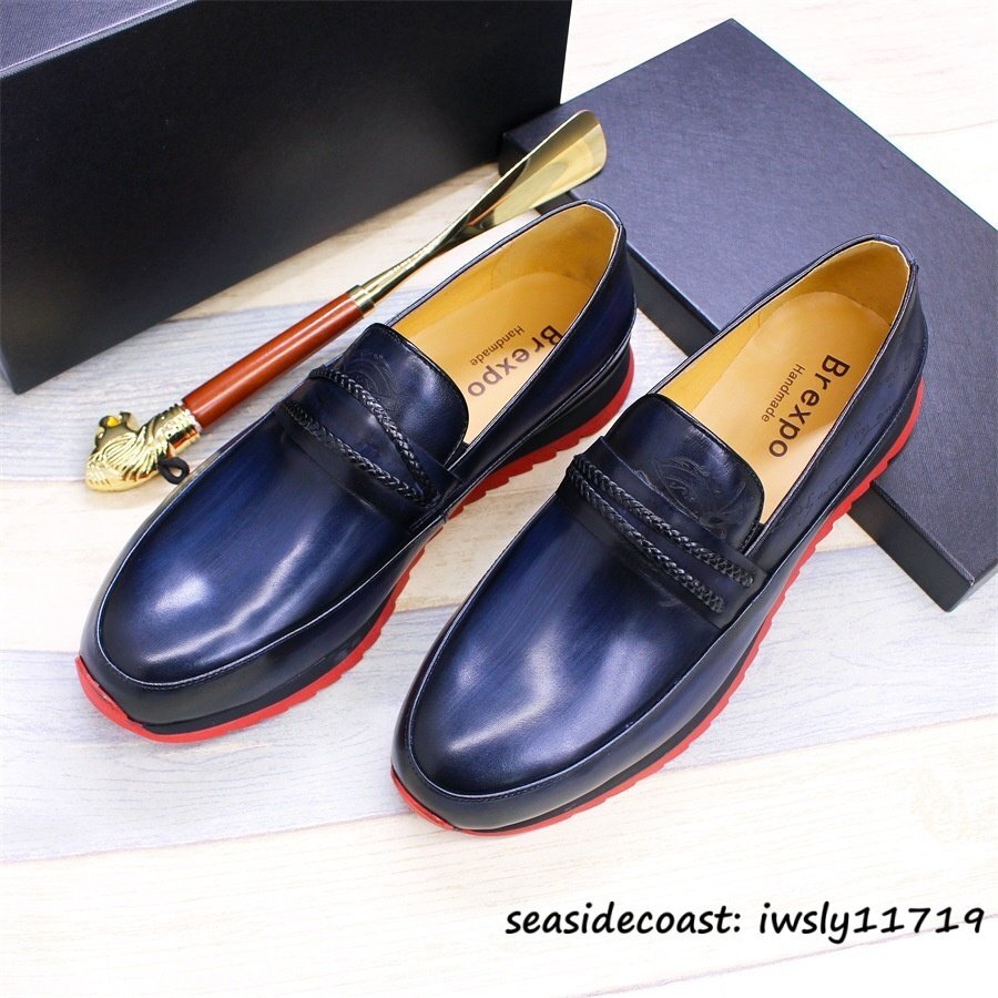 定価9万超◆最高級 ローファー メンズ 本革レザーシューズ ビジネスシューズ 牛革革靴 職人手作り 紳士靴 軽量 スリッポン ブルー 25.0cm