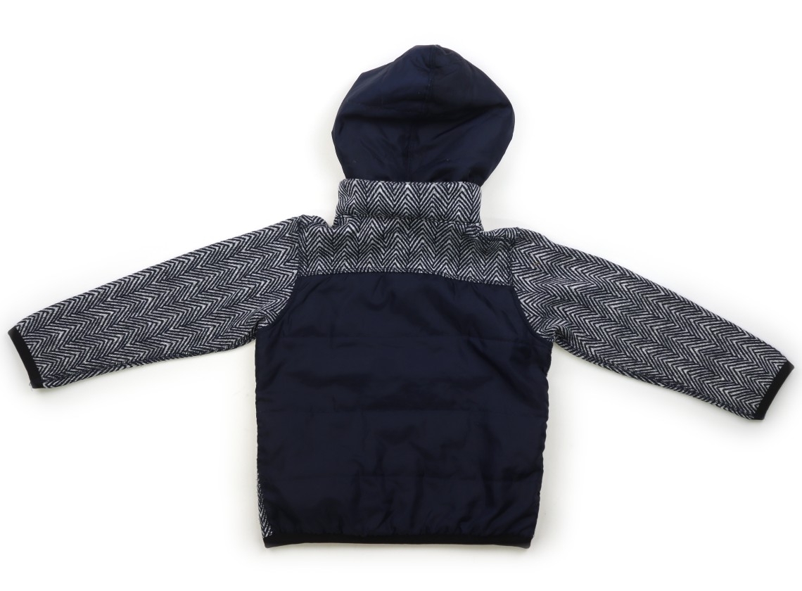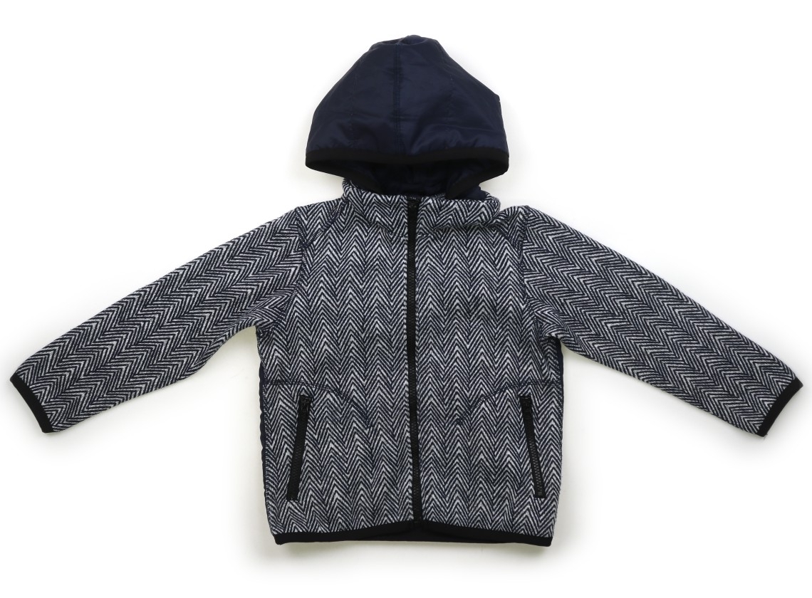 実際のサイズ表記は115。表地は無地部分はポリ地、柄はヘリンボーンニットで裏は起毛いています。薄手の中綿入り。フードの取り外しが可能です。ヘリンボーン部分に毛玉感あります。