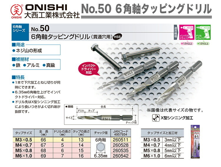 〈大西〉No.50 6角軸タッピングドリル M6×1.0 JAN:4957934260542