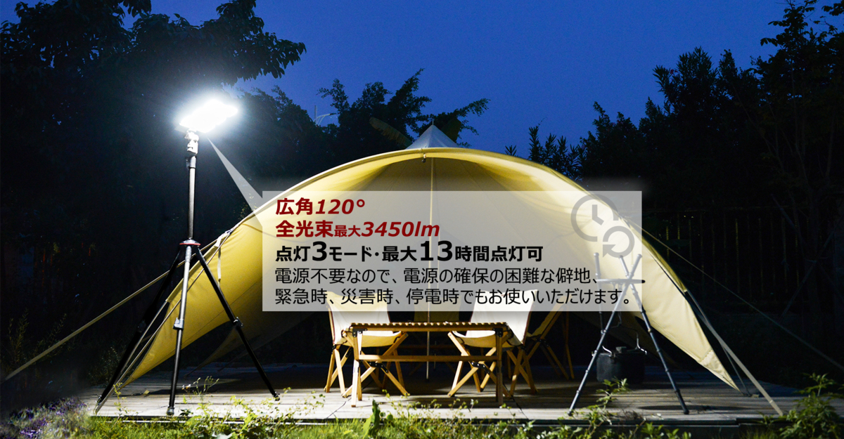 | 点灯時間 | HIGH:2時間 MIDDLE:4時間 LOW:13時間 | 照射角度 | 120°(HIGH・LOW)/15°(MIDDLE) |