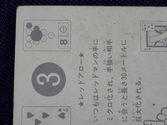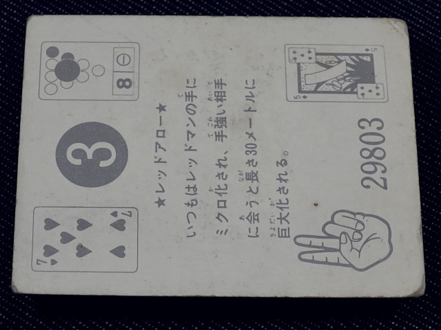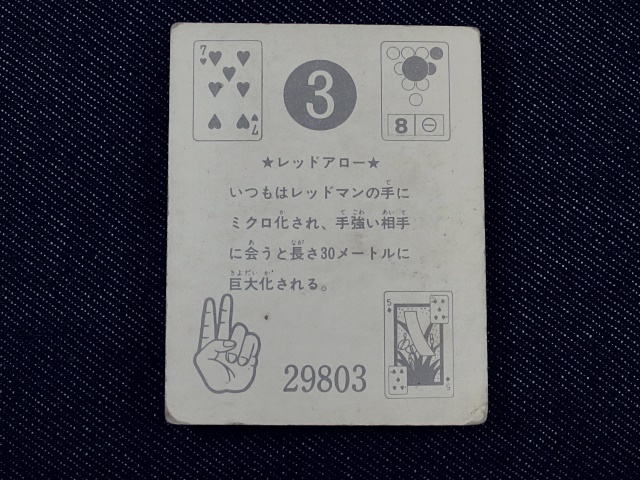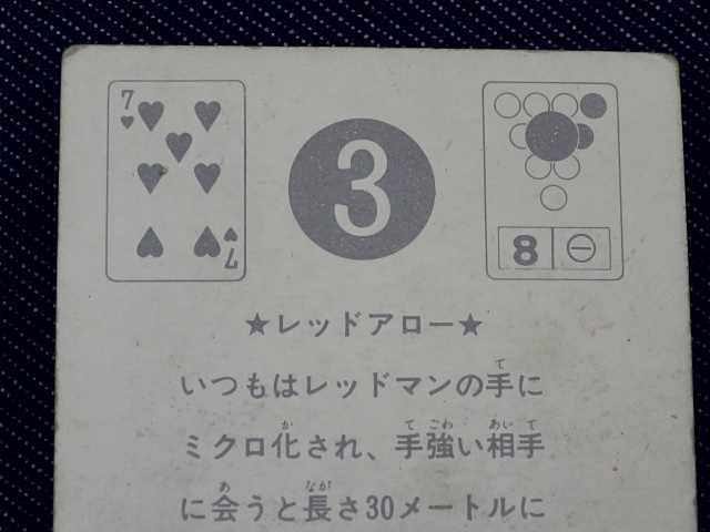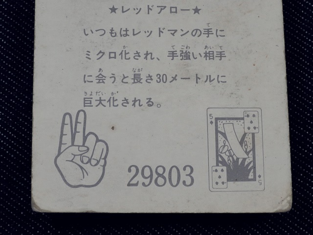 ミニカード_レッドマン_ブルマァク 70年代 バラ売り(1枚) ・メーカー:ブルマァク ・ 6.6 cm x 5.2 cm ・1972年 主に駄菓子屋にて2通りの発売 ・構成:全32種シリーズ(1-32番、AL_単体版・3タイトル合体版の各々1種) ・中古扱い ・同梱発送可能(複数落札の場合、送料が変わる場合があります。) 〓参考項目〓 ・1972年4月24日から10月3日 ・日本テレビ系の子供番組『おはよう!こどもショー』内で放送された円谷プロダクション制作の特撮コーナードラマ ・放映時間は1回当たり5分間、月曜から土曜の朝7時30分頃 - 7時35分頃放送。1話完結。 ・第94話から第99話のみ連作。全138話。 ・プロデューサー:近藤恒彦 ・監督:大塚莞爾、安藤達己 ・助監督:布施修、石田徹 ・撮影:大岡新一、佐藤和美 ・照明:伊藤裕二、田中謙二 ・操演:岸浦秀一 ・音楽:山下毅雄 ・制作:円谷プロダクション ・怪獣おじさん:朝戸鉄也 ・レッドマン:久須美護 ・怪獣:野武士の会 | ||