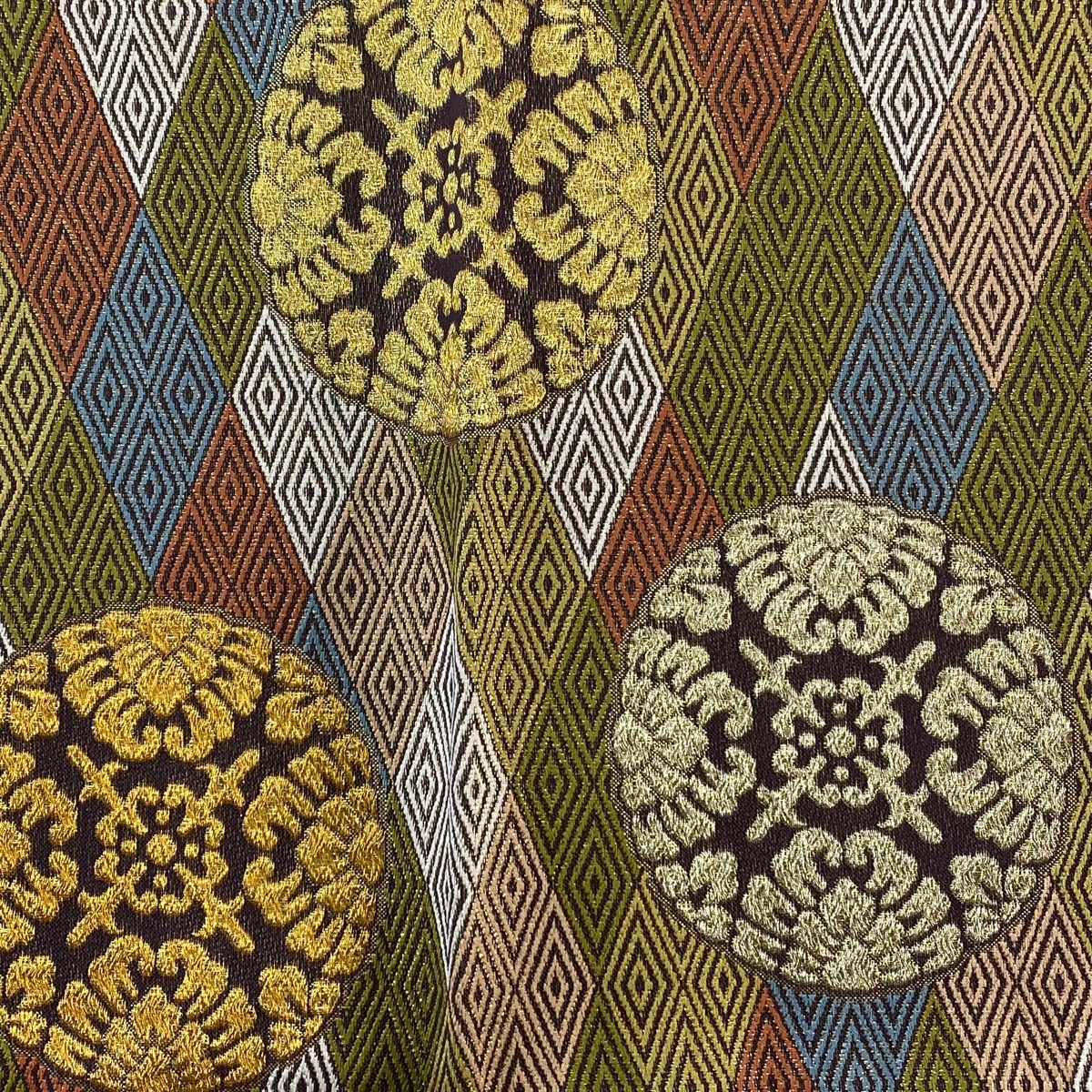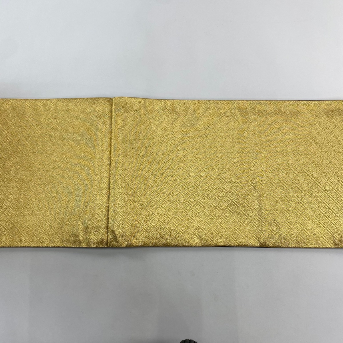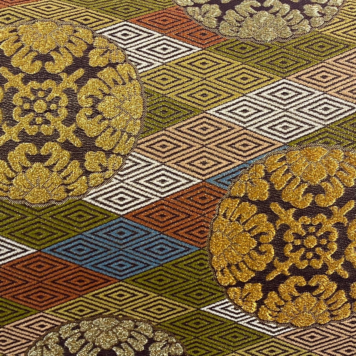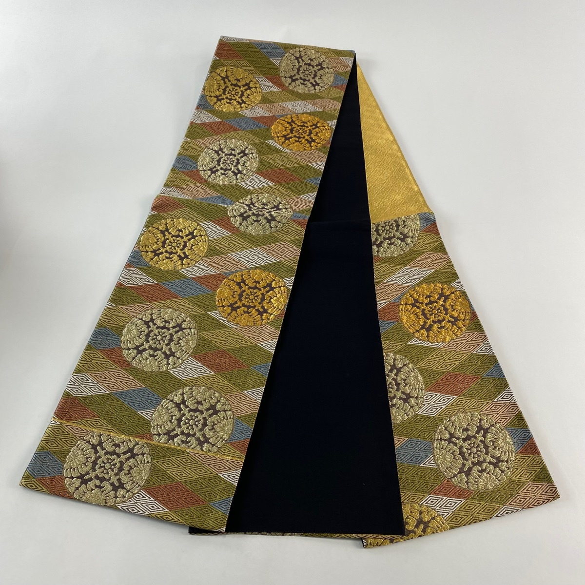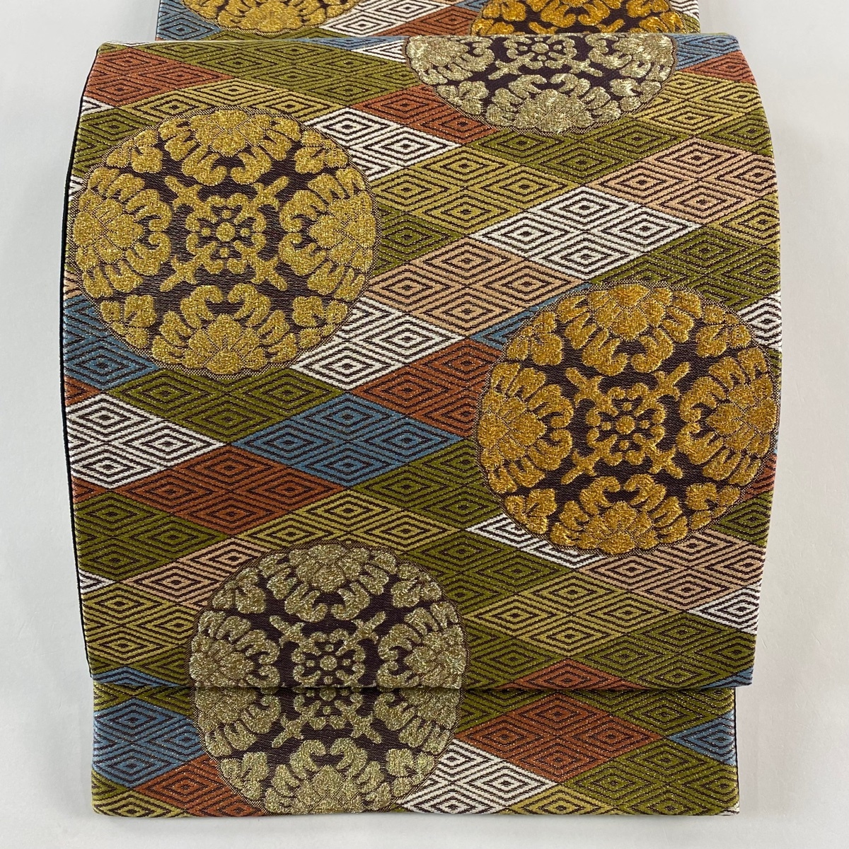 | 袋帯 美品 秀品 浮線綾文 入子菱 金糸 茶緑色 六通 正絹 【中古】 |