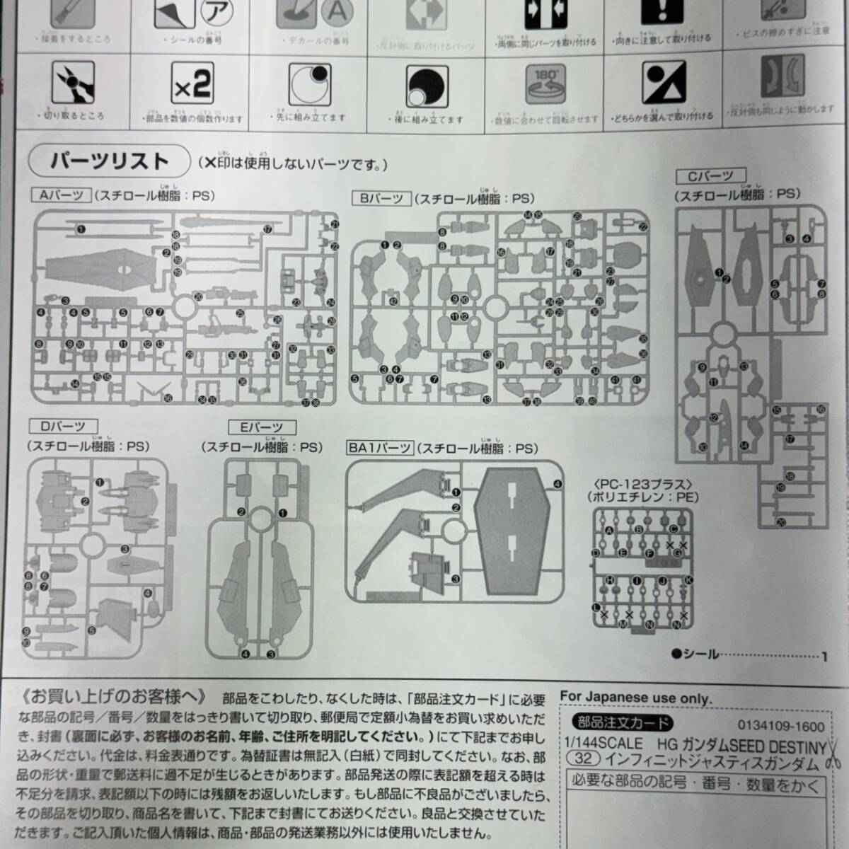 【商品状態】 ・未組立・内袋未開封の良品です。 ・全ランナー、ポリキャップ、シール、説明書、外箱すべて揃っています。 ・ランナー刻印は「1/144 HG インフィニットジャスティスガンダム」を確認済みです。 ・外箱に軽度のへこみがあります(画像参照)。
