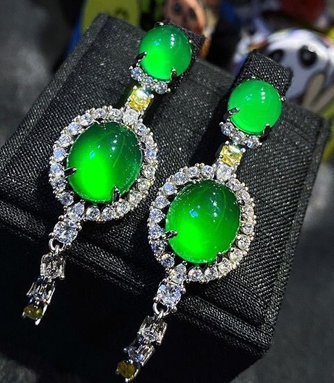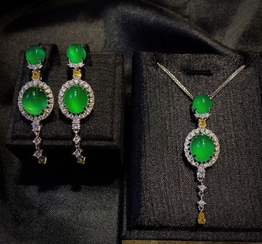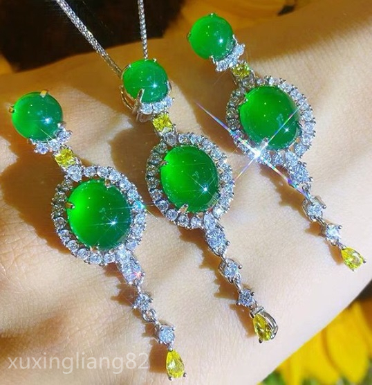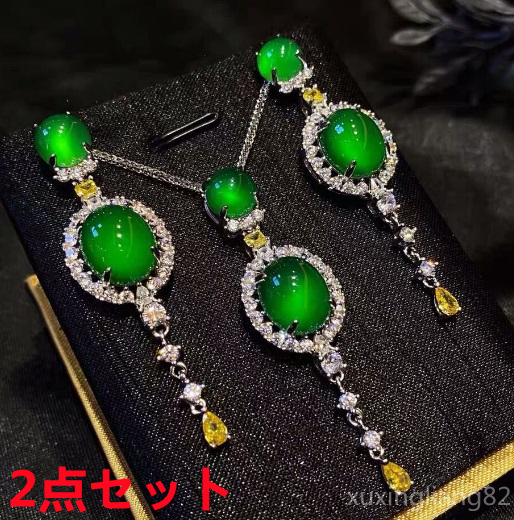 ジュエリー2点 ブラジル産 天然緑玉髄 ペンダントトップ ピアス 満々ジルコン メッキ アクセサリー