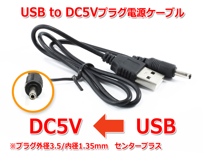 入力側はUSB A-TYPE オス、出力側はDCプラグ 外径3.5mm/内径1.35mmです。