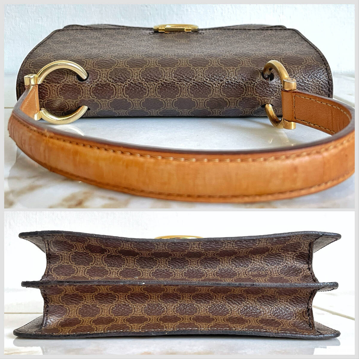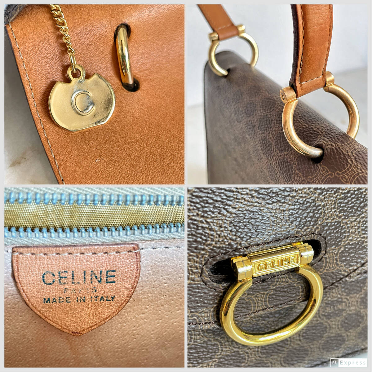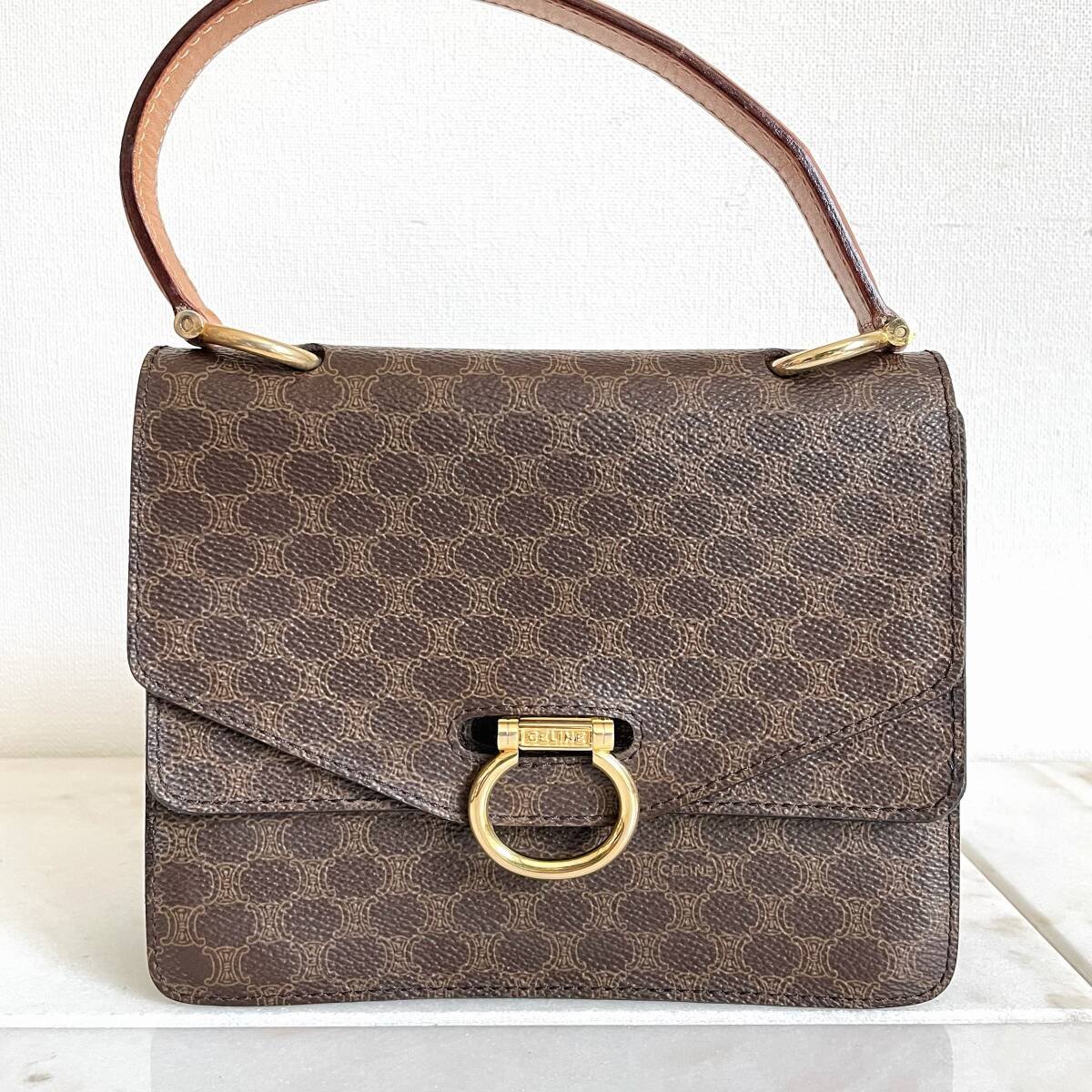 ☆激レア・ヴィンテージ☆ / CELINE セリーヌ / マカダム ガンチーニ Wフラップ ハンドバッグ / 茶 ブラウン / PVC +レザー / ゴールド金具 / イタリア製 正規品