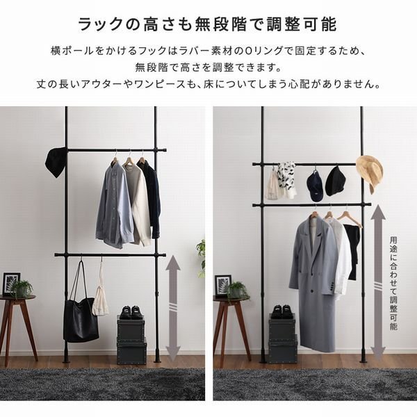 | 床と天井があれば、お部屋のどこでも使う事が出来る、おしゃれなつっぱりハンガーラック! 質感にこだわったデザインで、ざらりとした質感が高級感を演出します。 壁一面を衣類収納にしたり、ベッドサイドでコンパクトに使ったりできます。 また洗面所で使用したり、部屋干しをする際にも使用することができます。 横ポールが2段あるのでたっぷり収納できます。 高さ調節することができるのでコートなど丈が長い衣類も収納できます。 |