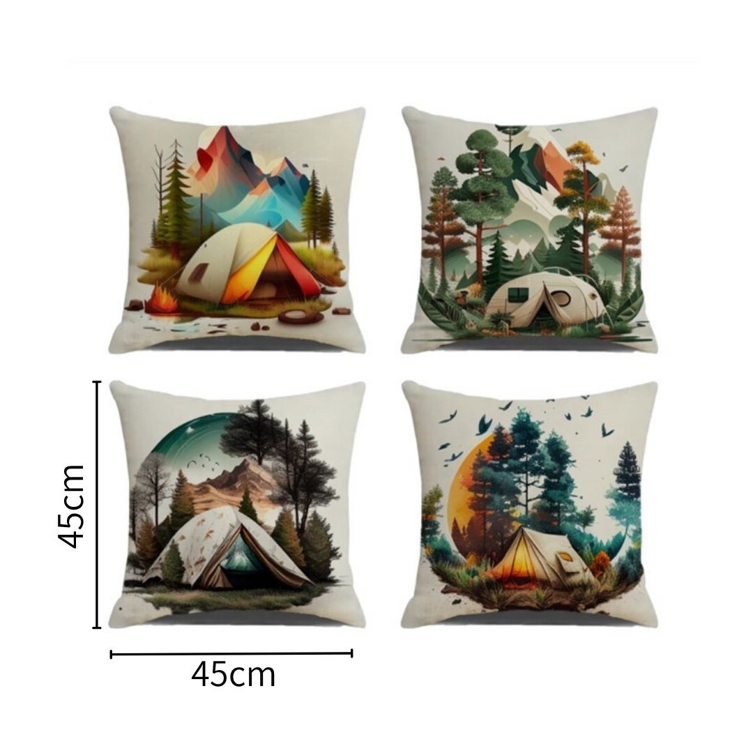 【4枚セット クッションカバー キャンプ テント柄】ポリエステル生地 45×45cm 北欧風 キャンプ テント柄 アウトドア◎◎