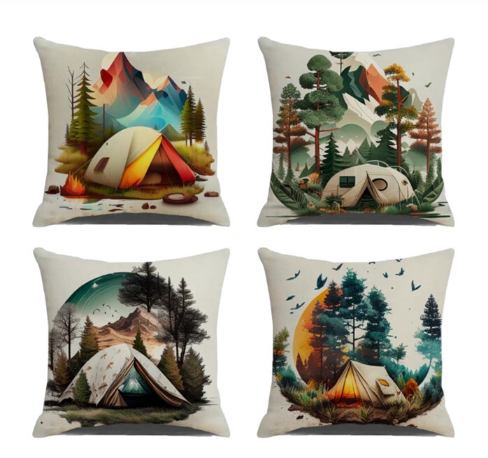 アウトドア好きにはたまらない、おしゃれなキャンプ柄クッションカバー4枚セットです。 お部屋やキャンプでのテント内を、一気に北欧風の洗練された空間に変えてくれます。