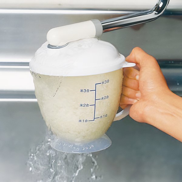蛇口から水を勢い良く注いで、流水で米を洗います。