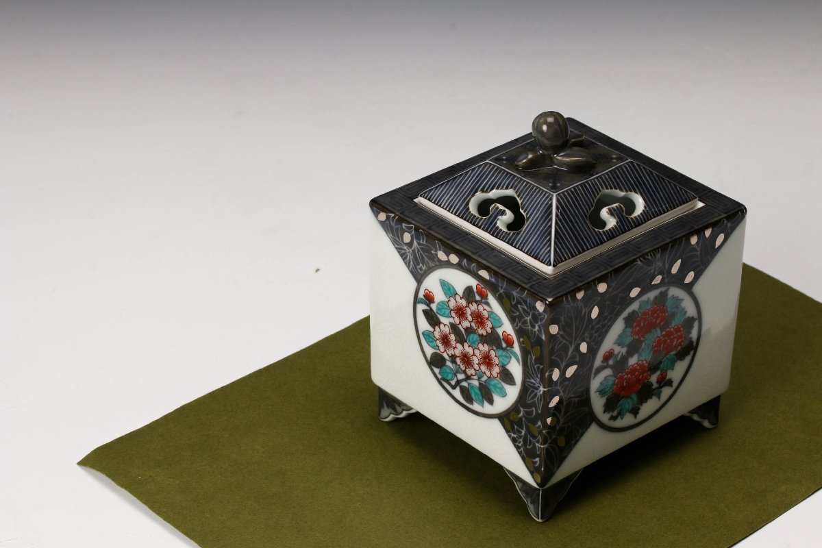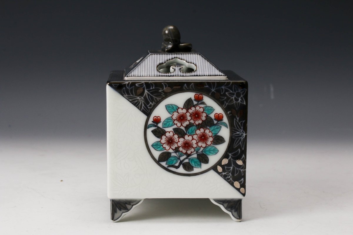 【佳香】人間国宝 十四代 今泉今右衛門 色絵雪花墨色墨はじき草花文香炉 共箱 共布 栞 茶道具 本物保証