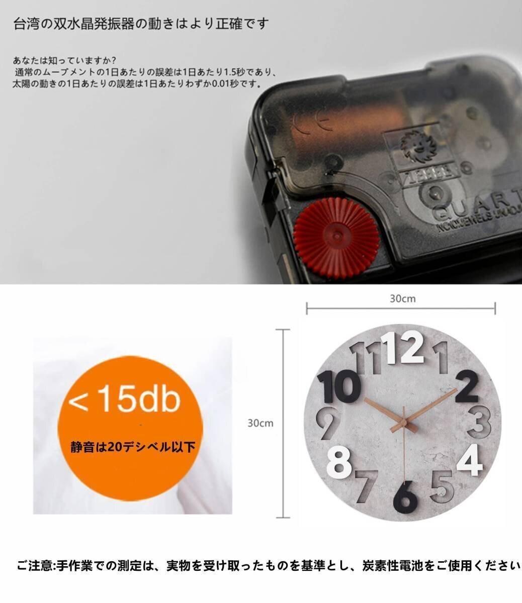 屋内/屋外使用 インドア【掛け時計 サイズ】サイズ:12インチ(時計直径30cm)×厚さ1cm (※サイズには多少の誤差が発生します。ご了承下さい。)本体重量:約600グラム 材質:天然木、電池:単3乾電池1本(付属電池なし) ご注意:アルカリ電池に対応できません。 ムーブメント:スイープタイプ(連続秒針)【セット内容】本体(電池が付属致しません)、取扱説明書、壁掛け用フック。※包装内には壁掛け用フックが付いています。画像のように、時計がしっかり掛かっていることをご確認ください。また、時計に傾きがあると時計の精度や機能が正常に働きません。【静音掛け時計】かけ時計 カチカチの音がしなくて、 音がほとんど聞こえません。音がしない滑らかに秒針が動く「連続秒針」を採用、正確な時間と絶対に静かな環境を保証します、良好な睡眠と仕事環境を創造します。壁掛け時計のムーブメントは厳しい検査を経て、精度は高いので、正確に時間を表示することができます。【見やすい】飽きの来ないデザインのおしゃれ北欧壁掛け時計。落ち着き、大人の色、高級感を与える。大きなアラビア数字が刻まれており、視認性が高くて、きくて子ども達も時間がわかりやすい。 おしゃれで和室、洋室に置いてもしっくりと馴染みます。簡単に掛けるだけであっという間におしゃれな空間に早変わり!【便利】掛け時計背面には引っ掛けるための穴が付いています。壁にネジやクギなどを打って、設置してください。また、乾電池だから取り換えも簡単。単三乾電池1本付き。取り付け用のネジは付属していません。【品質保証】弊社の商品を発送する前に非常に厳密な点検を受けられて、品質が保証されます。※弊社の商品は運輸途中で損壊されると、もしくは、商品に不具合や破損がございましたら、弊社までメールにてご連絡頂きますようお願い致します。営業日24時間以内に対応させていただきます。