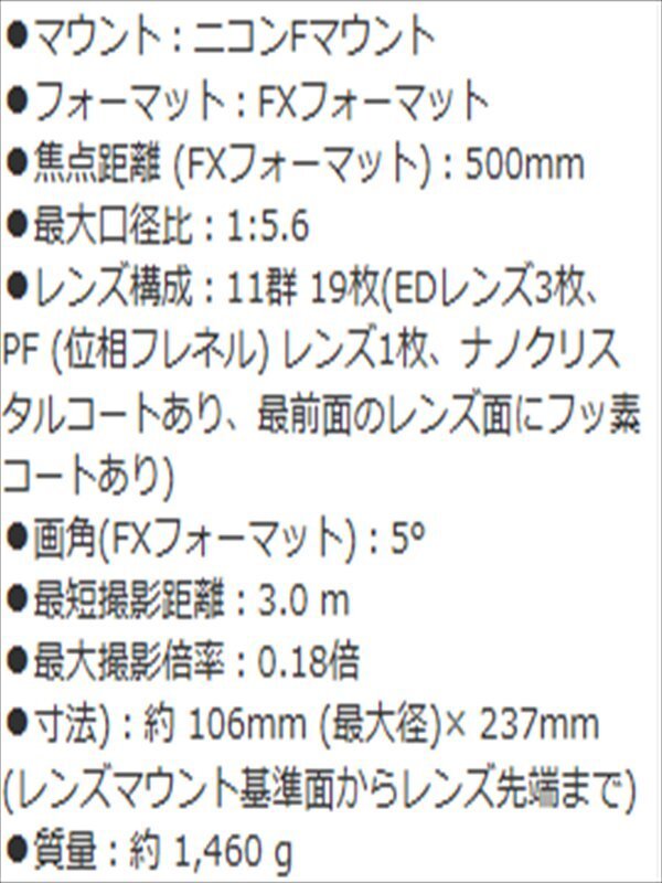 | 名 称 | ニコン Nikon AF-S NIKKOR 500mm f/5.6E PF ED VR カメラレンズ | ||