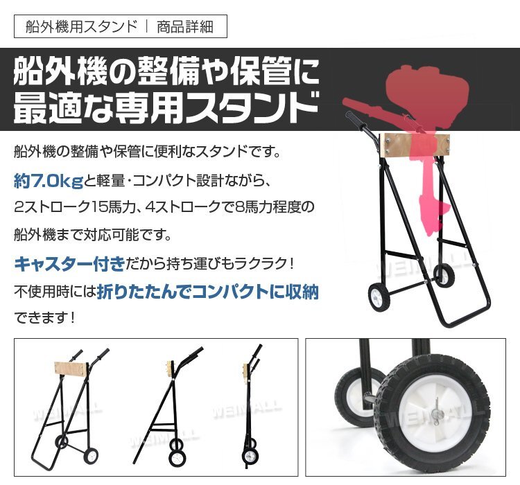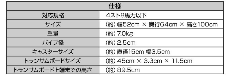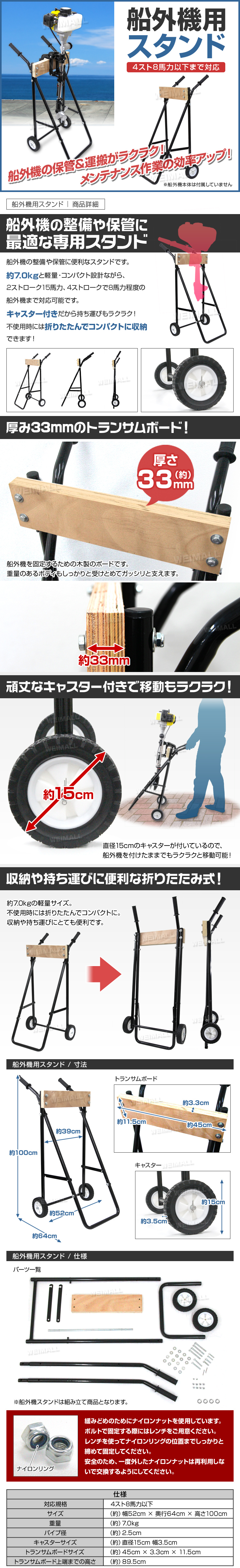 コンパクトですが、2ストで15馬力、4ストで8馬力程度の船外機まで使用できます。 キャスター付きですので船外機を付けたままでの移動もラクラクです。 コンパクトに収納可能! 未使用時はコンパクトに折りたたんで収納できるので、場所も取らずとっても便利です。 船外機のメンテナンス時・保管時に大変便利です! 【商品仕様】 適用船外機:2スト15馬力/4スト8馬力程度まで サイズ(約):幅520×奥行640×高さ1000mm(開脚時) 重量(約):7.0kg パイプ径(約):25mm 折りたたみ時の厚み(約):180mm トランサムボードサイズ(約):幅450mm×高さ1150mm×厚み33mm トランサムボード上端からの地上高(約):885mm 材質:スチール(ブラックペイント) 【注意事項】 ・商品は組み立て式です。・トランサムボードは、写真と異なる場合があります。ご了承ください。 ・組み立てにはスパナなどの工具が必要になります。 ・商品は、モニターによって色合いが異なって見える場合があります。 ・仕様・デザインは改良のため予告なく変更することがあります。 |