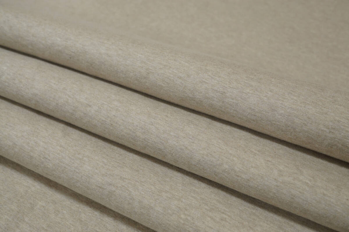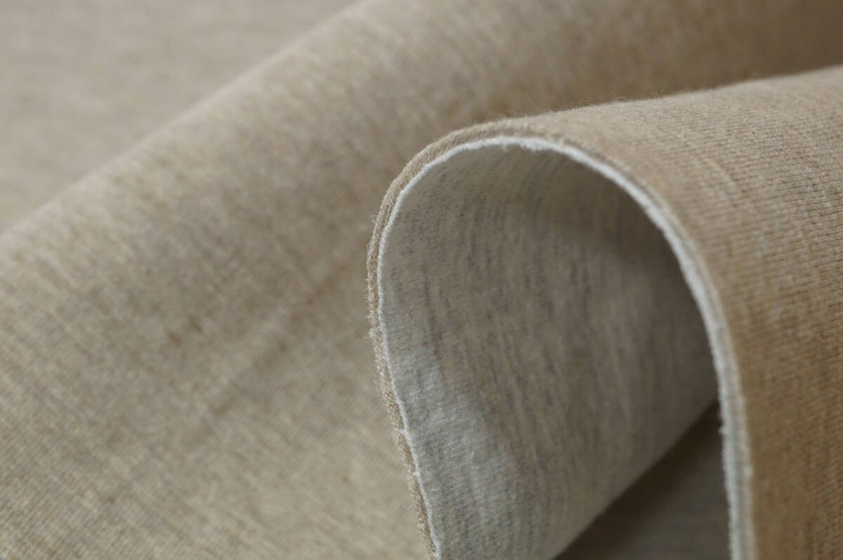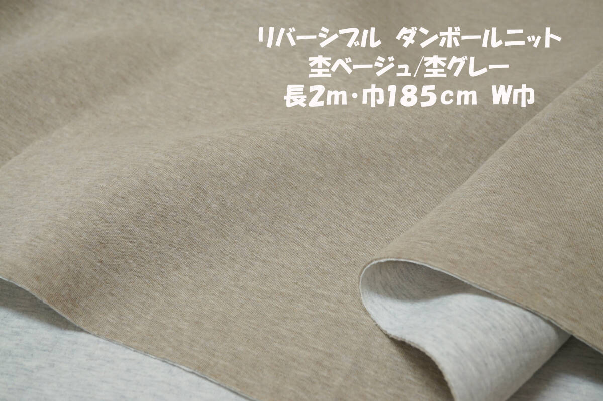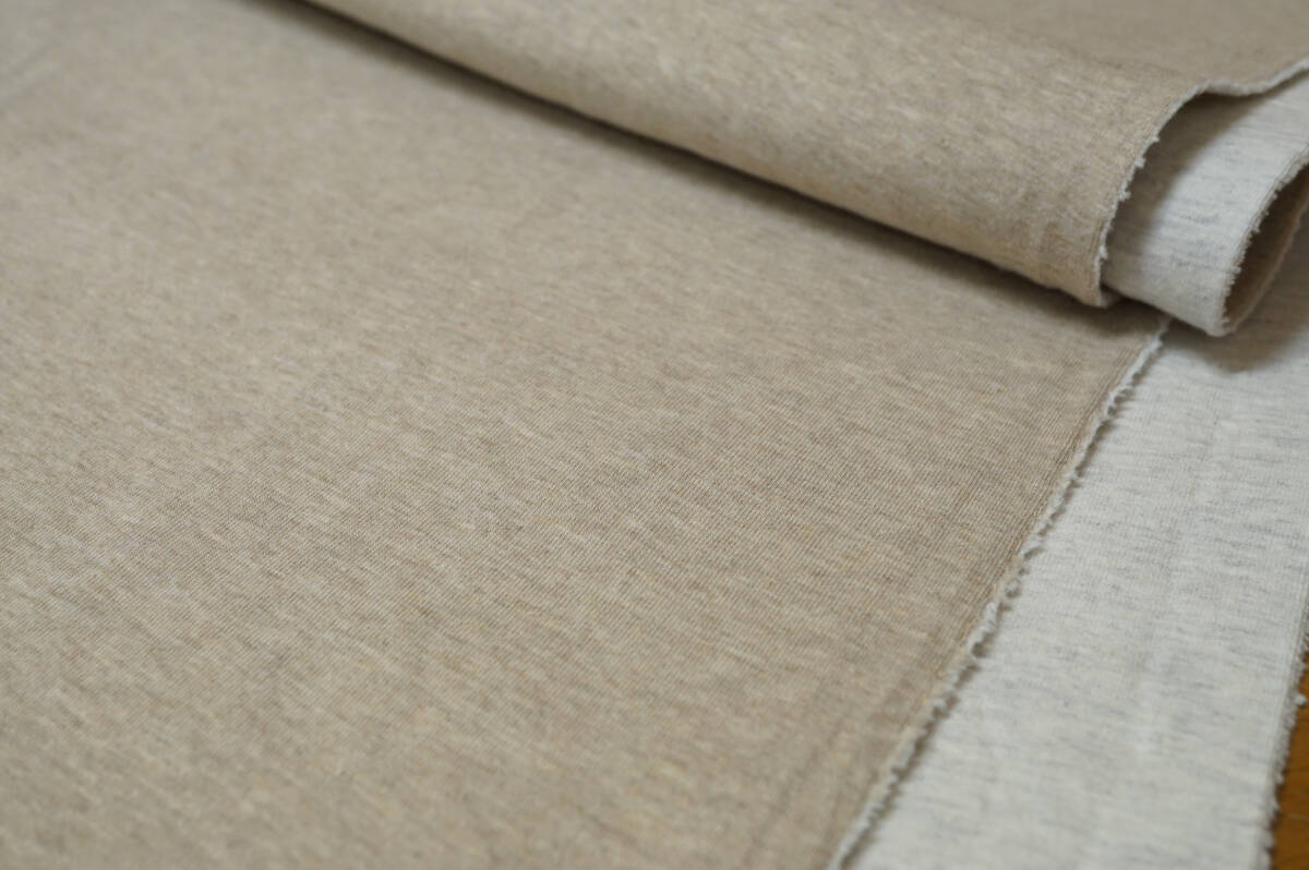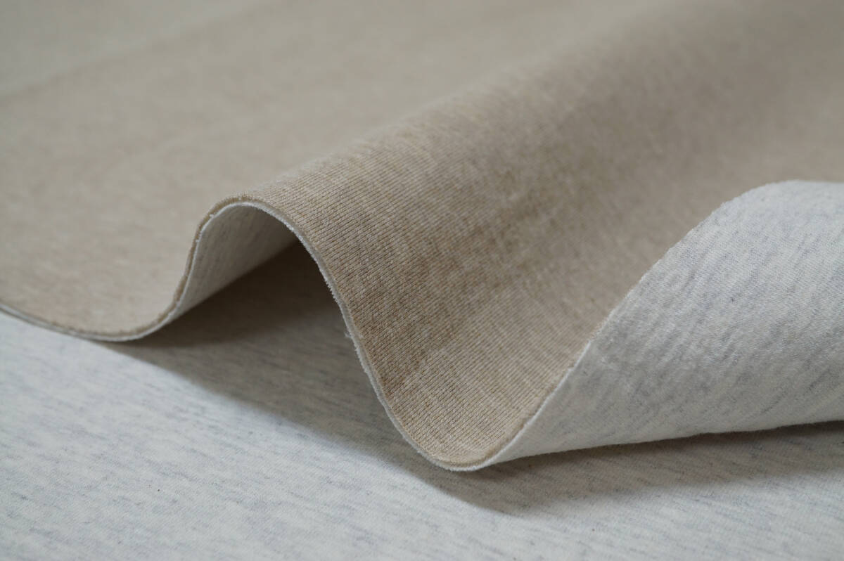 おそらく綿・ポリエステル・ポリウレタン混、やや厚地~微厚、もっちりとしたソフト系で2way伸縮タイプ、色調:杢ベージュ×杢ライトグレー、二重構造の間に空気をため込むため保温性があります。