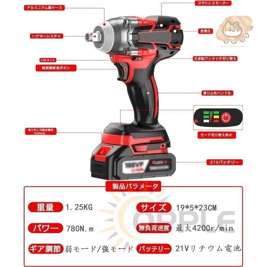 電動インパクトレンチ 最大トルク780N・m 18Vバッテリー互換 自動停止モード 無段変速・正逆転両用 機械修理 脱着 zhw041