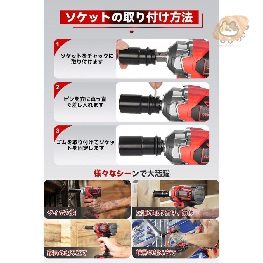 ナットのサイズに対応したソケットを差し込むだけで、すぐ応用でき、工具を使わず、自由に交換できる便利さを持ってます。「レンチ」-ナットとボルトを締めます。本体の差し込み角が12.7mm(1/2インチ)で、ほとんどの市販のソケットを使用でき、使えるに幅広いインパクトレンチです。「コードレスドライバー」チャックは、スクリュービットのねじ込みに適しています。六角ドリルで