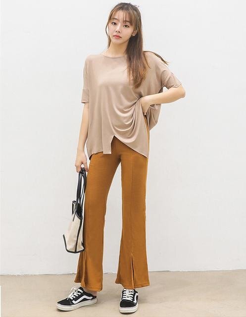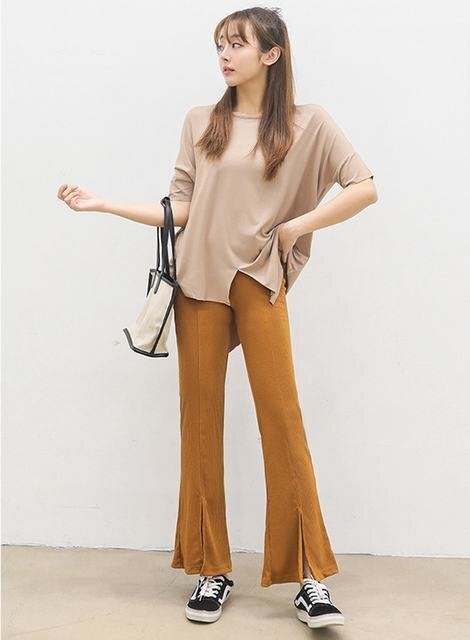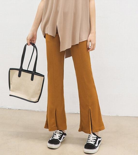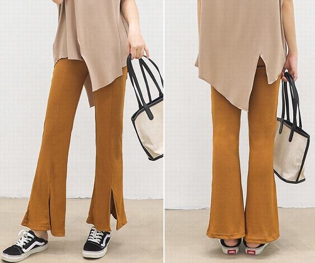 フレアリブパンツ ストレッチパンツ ウエストゴム 伸縮性 ズボン ハイウエスト 美脚 スッキリ ロングパンツ フィット 無地 コーヒー