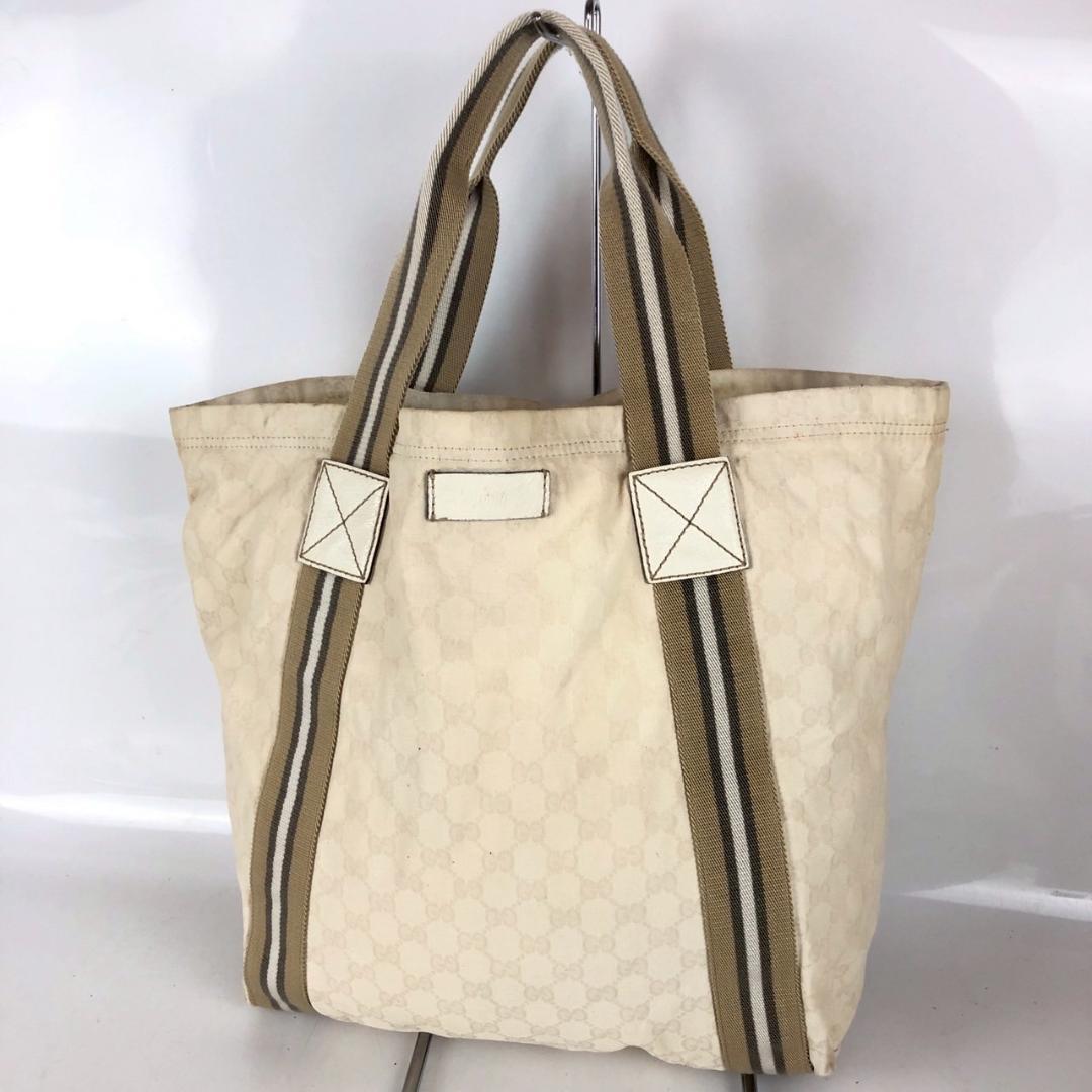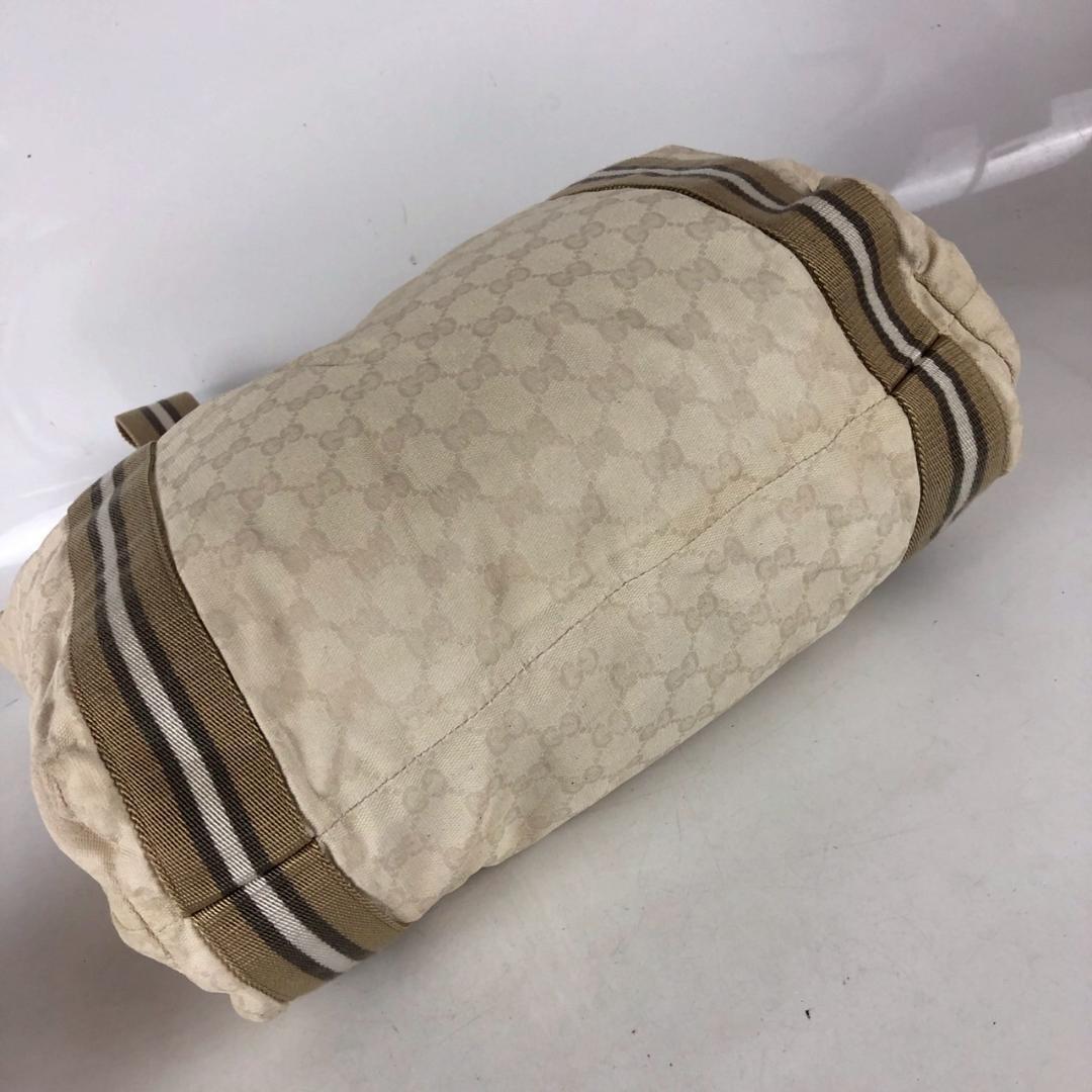 全体的に使用感はありますが、まだまだ普段使いに十分ご利用いただける状態です。外側には薄汚れや擦れ、部分的に色あせがございます。内側には多少の汚れや使用感が見られます。取っ手には毛羽立ちや使用感があり、長さは20cmです。シェリーラインがアクセントとなり、GUCCIらしい存在感を放つ一品です。軽量でマチもしっかりあるため収納力に優れ、日常のサブバッグやお買い物バッグとしても活躍します。