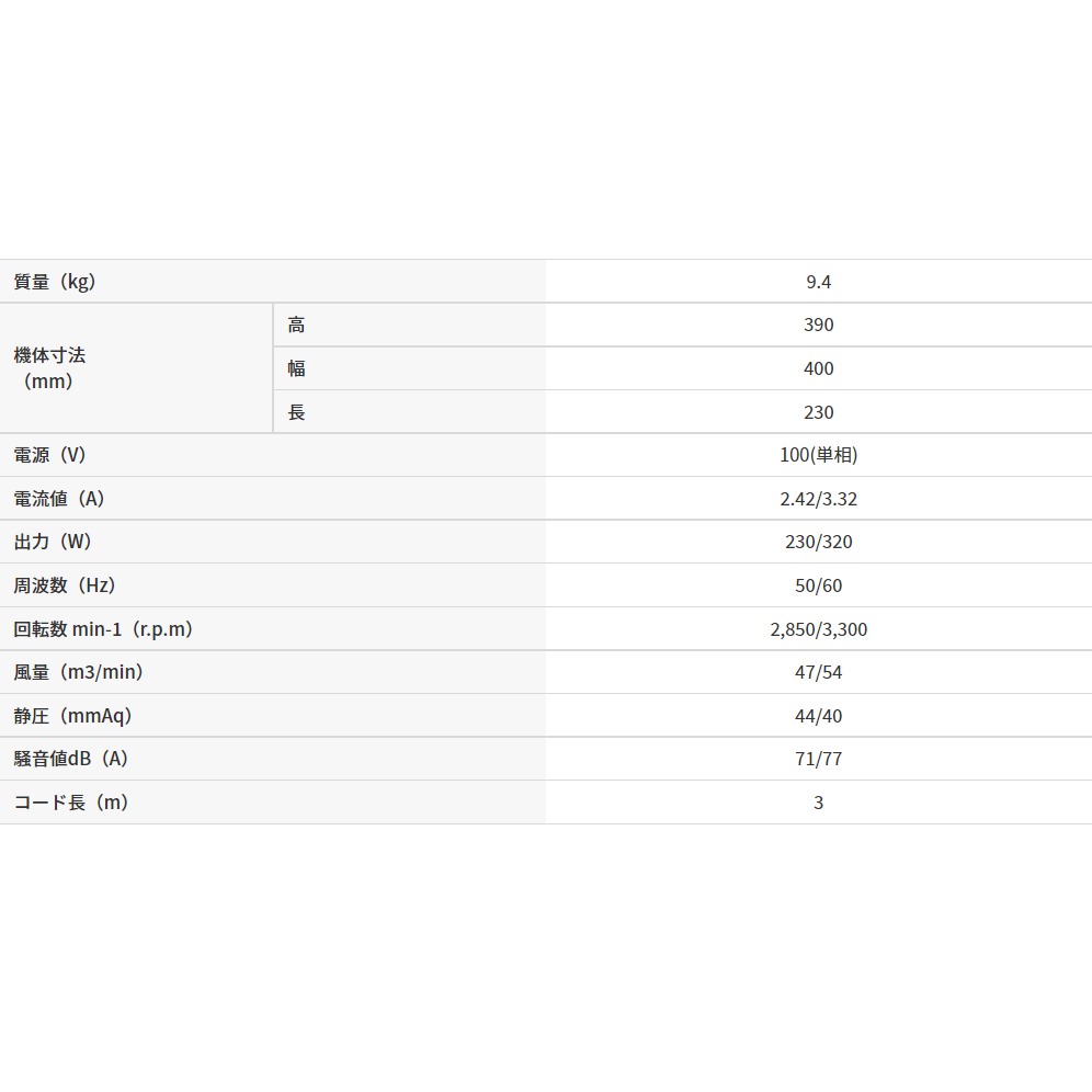 送風機 MPF-300A特殊モーターの採用により省エネを達成しました。小型、軽量(9.4kg)なので運搬、移動が片手で容易にできます。ファンが上下に傾斜可能でダクトを折らずに使用できます。