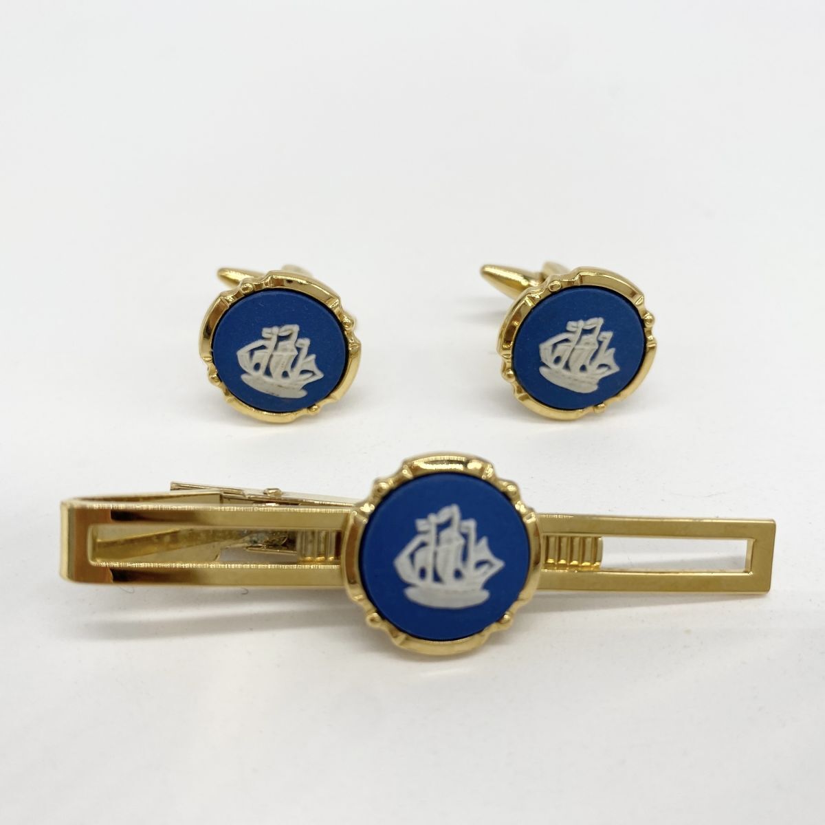 | 【22623】WEDGWOOD ウェッジウッド ネクタイピン カフス 2点セット ジャスパー 刻印有 帆船 ブルー×ゴールド 中古品 クリックポスト | |