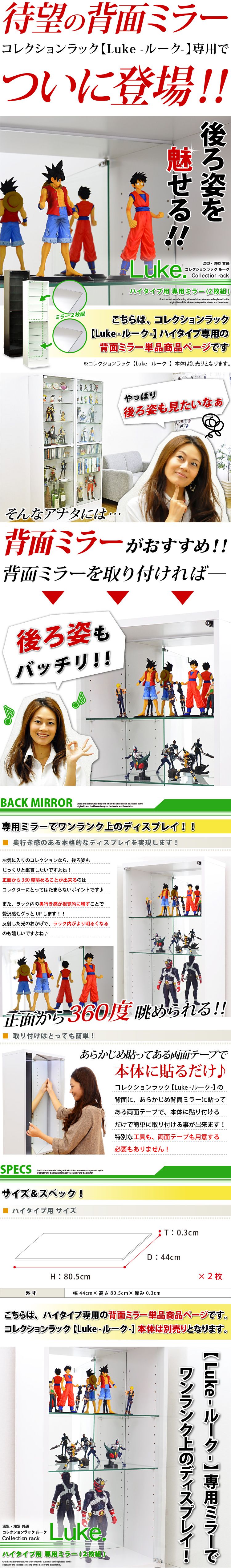 【ポイント】 ①背面ミラー取り付けで、奥行きのあるディスプレイを実現します。 ②自慢のコレクションを魅力的にディスプレイできます。 ③両面テープで背板にカンタン取り付けできます。 ④本体設置後の後付けも可能です。 |