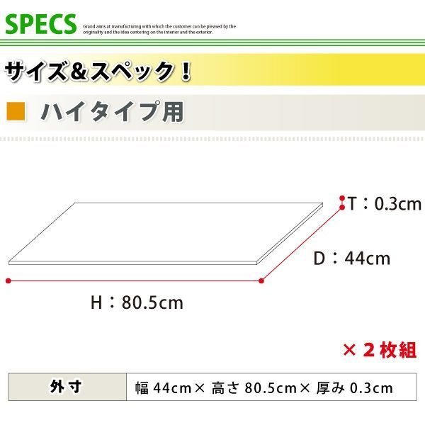 【サイズ】 (約)幅44×高さ80.5×厚み0.3cm 【梱包】 サイズ:(約)45×85×1cm 重量:(約)4kg 【その他】 ・両面テープで背板に取り付けます。 ・本体設置後の後付けも可能です。 ・上下の棚の各1枚×計2枚の1セットです。 |