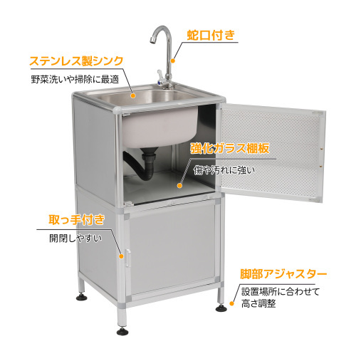 • ◎03【囲い付きでスッキリ!ステンレス製流し台】アルミ製の囲いパネルでしっかり目隠し。外から見えてほしくない物もすっきり隠せます。囲い付きの2段棚で、洗剤やバケツなどを使いやすく収納でき、まわりも清潔感のある印象に。(各段耐荷重20kgで、たっぷり収納OK!)