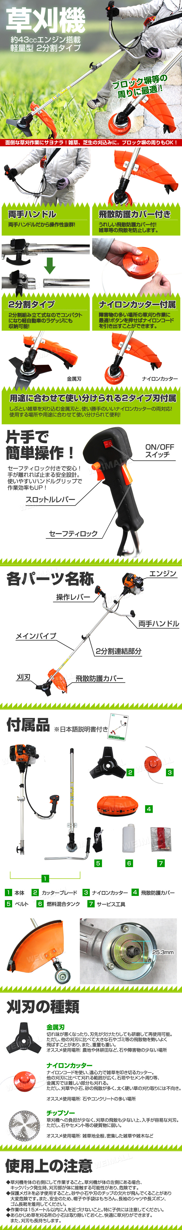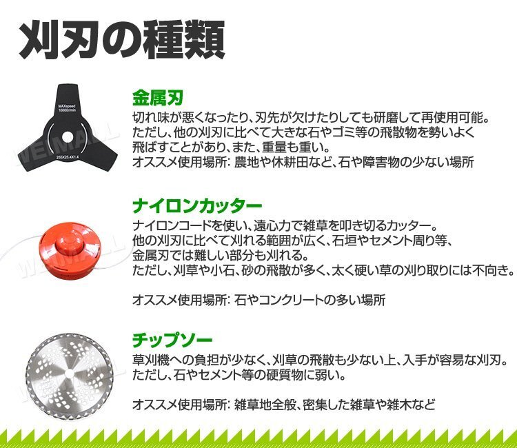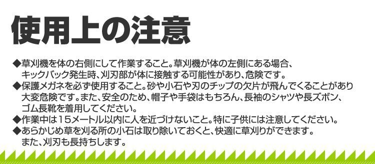 | 草刈り機 エンジン式 軽くてパワー2ストロークエンジンは、伸びてしまった草や固くなった枯れ草などをガンガン刈ってくれます。 スロットルを握れば回転、放せば停止する安心設計です。 柔らかい草や金属刃では刈ることができないところ(フェンスなど)で刈るナイロンカッター付き! 軽作業から農家、造園業の方に! |
