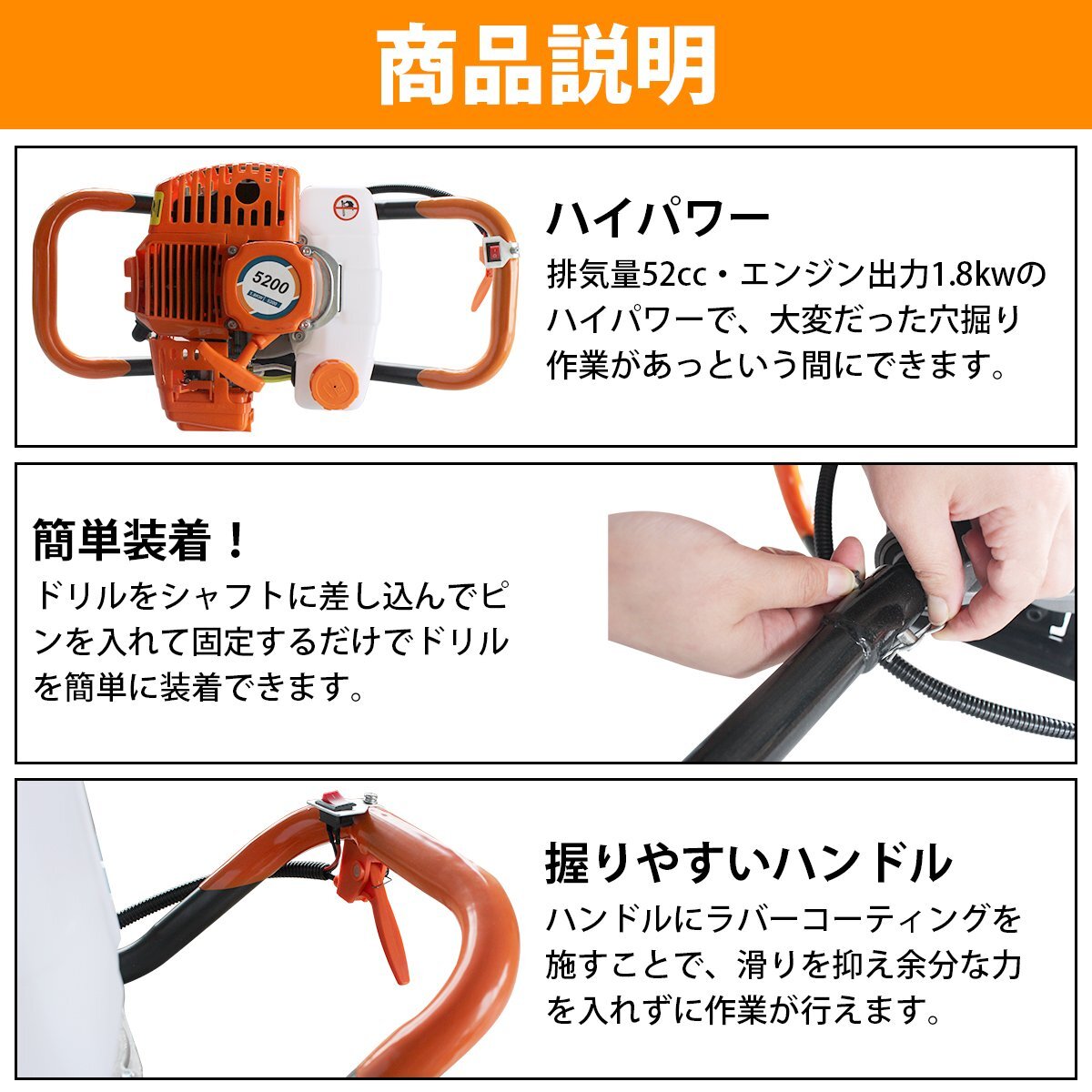商 品 説 明地面に穴を開ける穴掘り機!ガソリンで動くエンジン式です。