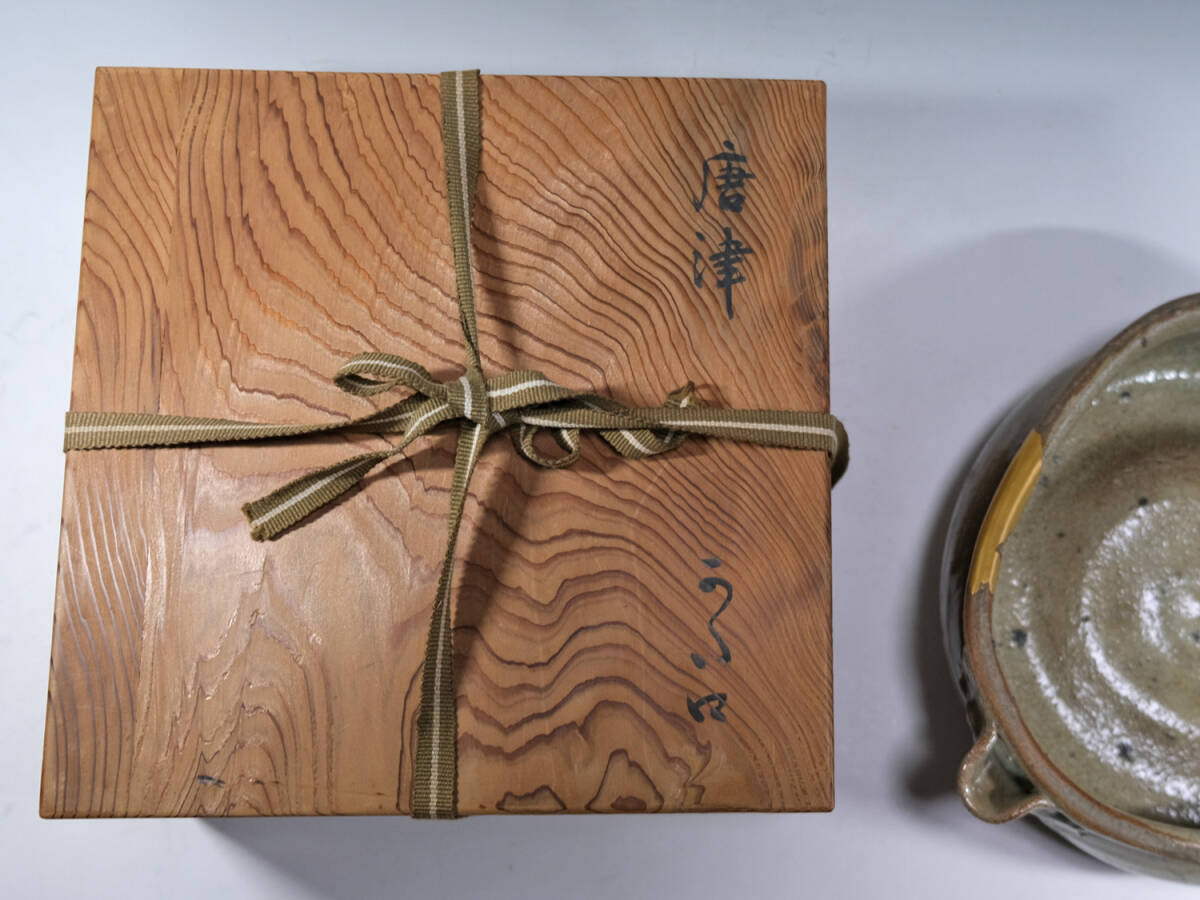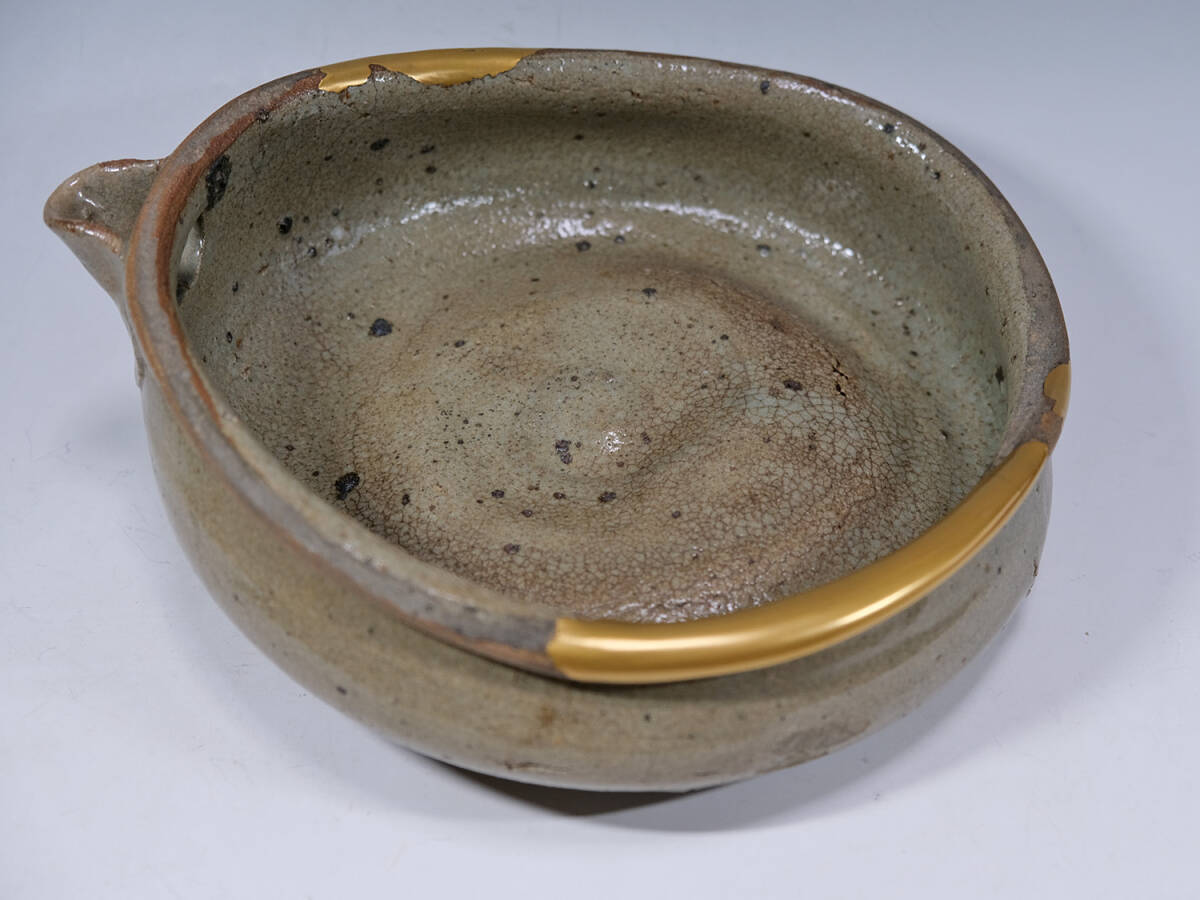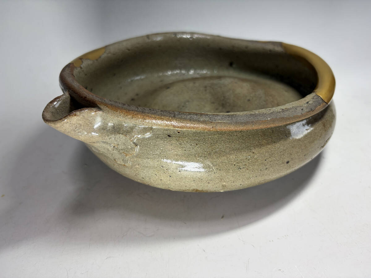 口径24×19cm。最大高8.5cm,最小高5cm。高台径11cm。発掘伝世と思われます。窯の中で底がへたって変形しています。口縁はくっつき跡とニューも見えます。古い金直しです。口は奇跡的に無傷です。その他火膨れやごまもあり、見どころ山積です。どっしりとした、本歌古唐津の片口を次の代に引き継いで欲しいと思います。