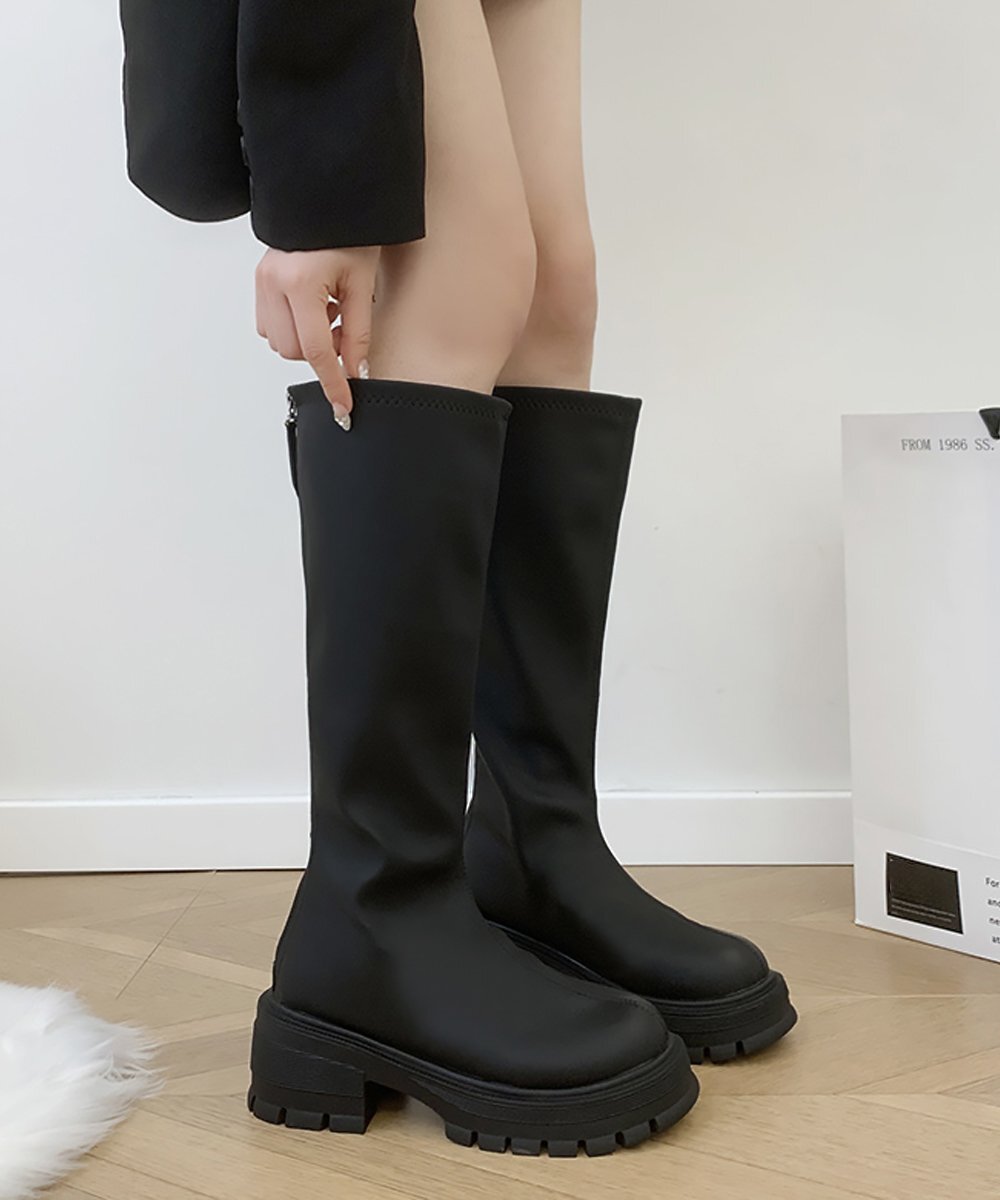 レディースブーツ チャンキーヒール 秋冬 膝下 おしゃれ バックジップ 歩きやすい カジュアル 美脚脚長ブーツ 人気くつ